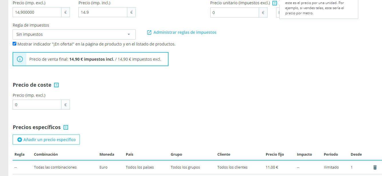 tonitv Posted February 3, 2021 Share Posted February 3, 2021 Hi there, I am trying to show the specific fixed price and the price exclude tax, by default only the fixed price is shown and I would like it to show the exclude price as if it were an offer, is it possible to do that or I need a module. I have been testing on product.tpl of my theme. But I don't get any ideas. Prestashop 1.7.6.2 Thank you very much. Link to comment Share on other sites More sharing options...