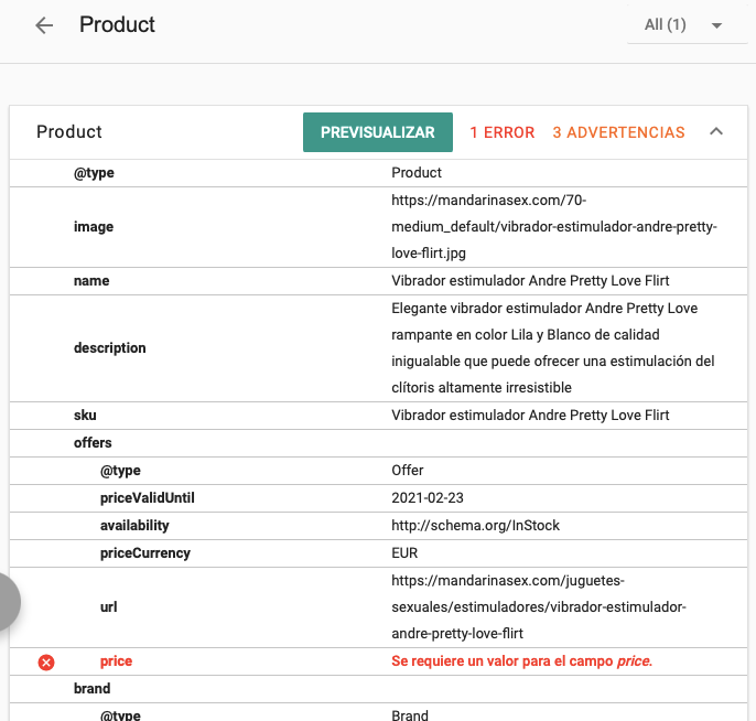 Recientemente he puesto en marcha una nueva tienda online. Pero Google Search Console me indica en todos los productos que ha indexado que Falta el campo "price", aunque el precio está puesto.