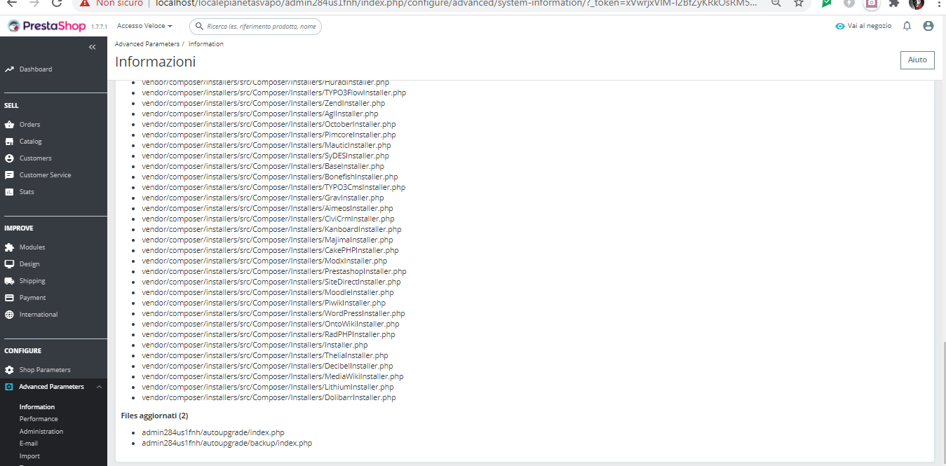 Pianetasvapo Posted February 8, 2021 Share Posted February 8, 2021 Ciao a tutti, sto aggiornando in locale il mio shop e dopo l'aggiornamento, dal modulo one click, visualizzo i seguenti errori: admin/autoupgrade/index.php admin/autoupgrade/backup/index.php img/cms/cms-img.jpg img/s/2.jpg img/favicon.ico img/404.gif img/logo.jpg modules/dashactivity/dashactivity.php modules/ps_categorytree/views/templates/hook/ps_categorytree.tpl modules/ps_categorytree/category-tree-branch.tpl modules/ps_categorytree/img/index.php modules/ps_categorytree/img/icon/open-close.png modules/ps_categorytree/img/icon/index.php modules/ps_categorytree/img/arrow_right_2.png modules/ps_categorytree/sort_alphabet.png modules/ps_categorytree/index.php modules/ps_categorytree/config.xml modules/ps_categorytree/ps_categorytree.php modules/ps_categorytree/sort_number.png modules/ps_categorytree/logo.png modules/ps_crossselling/views/templates/hook/ps_crossselling.tpl modules/ps_crossselling/views/templates/hook/index.php modules/ps_crossselling/views/templates/index.php modules/ps_crossselling/views/index.php modules/ps_crossselling/index.php modules/ps_crossselling/config.xml modules/ps_crossselling/ps_crossselling.php modules/ps_crossselling/logo.png modules/ps_customeraccountlinks/ps_customeraccountlinks.php modules/ps_customeraccountlinks/index.php modules/ps_customeraccountlinks/config.xml modules/ps_customeraccountlinks/logo.png modules/ps_customeraccountlinks/ps_customeraccountlinks.tpl modules/ps_dataprivacy/index.php modules/ps_dataprivacy/config.xml modules/ps_dataprivacy/ps_dataprivacy.php modules/ps_dataprivacy/logo.png modules/ps_shoppingcart/controllers/front/ajax.php modules/ps_shoppingcart/img/index.php modules/ps_shoppingcart/img/icon/pict_add_cart.png modules/ps_shoppingcart/img/icon/basket.png modules/ps_shoppingcart/img/icon/index.php modules/ps_shoppingcart/img/icon/checkout.png modules/ps_shoppingcart/img/icon/basket_go.png modules/ps_shoppingcart/ps_shoppingcart.tpl modules/ps_shoppingcart/ps_shoppingcart.php modules/ps_shoppingcart/index.php modules/ps_shoppingcart/ps_shoppingcart.js modules/ps_shoppingcart/config.xml modules/ps_shoppingcart/logo.png modules/ps_shoppingcart/ps_shoppingcart-product-line.tpl modules/ps_shoppingcart/composer.lock modules/ps_shoppingcart/modal.tpl modules/ps_themecusto/ps_themecusto.php modules/ps_themecusto/controllers/admin/AdminPsThemeCustoConfiguration.php modules/ps_themecusto/controllers/admin/AdminPsThemeCustoAdvanced.php modules/ps_themecusto/config.xml modules/ps_themecusto/logo.png modules/ps_themecusto/composer.lock override/controllers/front/index.php override/controllers/index.php override/controllers/admin/templates/index.php override/controllers/admin/index.php override/index.php override/classes/index.php override/classes/cache/index.php override/classes/controller/index.php override/classes/db/index.php override/classes/exception/index.php override/classes/helper/index.php override/classes/log/index.php override/classes/module/index.php override/classes/order/index.php override/classes/pdf/index.php override/classes/range/index.php override/classes/shop/index.php override/classes/stock/index.php override/classes/tax/index.php override/classes/tree/index.php override/classes/webservice/index.php override/modules/index.php TRADUZIONE FILE (S) (7) modules/ps_categorytree/translations/index.php modules/ps_crossselling/translations/index.php modules/ps_customeraccountlinks/translations/index.php modules/ps_shoppingcart/translations/index.php modules/ps_themecusto/translations/it.php modules/ps_themecusto/translations/es.php modules/ps_themecusto/translations/fr.php Grazie a tutti per gli aiuti Link to comment Share on other sites More sharing options...