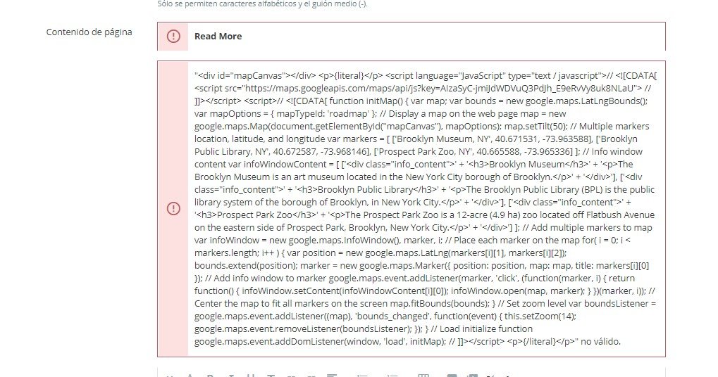 Edlloro Posted February 10, 2021 Author Share Posted February 10, 2021 Hola, Gracias por tus soluciones. He probado la segunda, porque me parecía más rápida (no dispongo ahora de mucho tiempo). La primera la probaré esta tarde. Meter el código dentro de {literal}, no me funciona. De hecho, me da el mismo error que ayer (adjunto captura de pantalla). No sé porque, al darle Guardar en la página CMS, me pone el literal dentro de un <p>... El código de la página CMS es sencillo: <div id="mapCanvas"></div> {literal} AQUI COPIO EL CÓDIGO DE LA PÁGINA DEL ENLACE QUE MANDÉ EN MI PRIMER MENSAJE {/literal} Pero el resultado es el que he comentado antes.... Link to comment Share on other sites More sharing options...