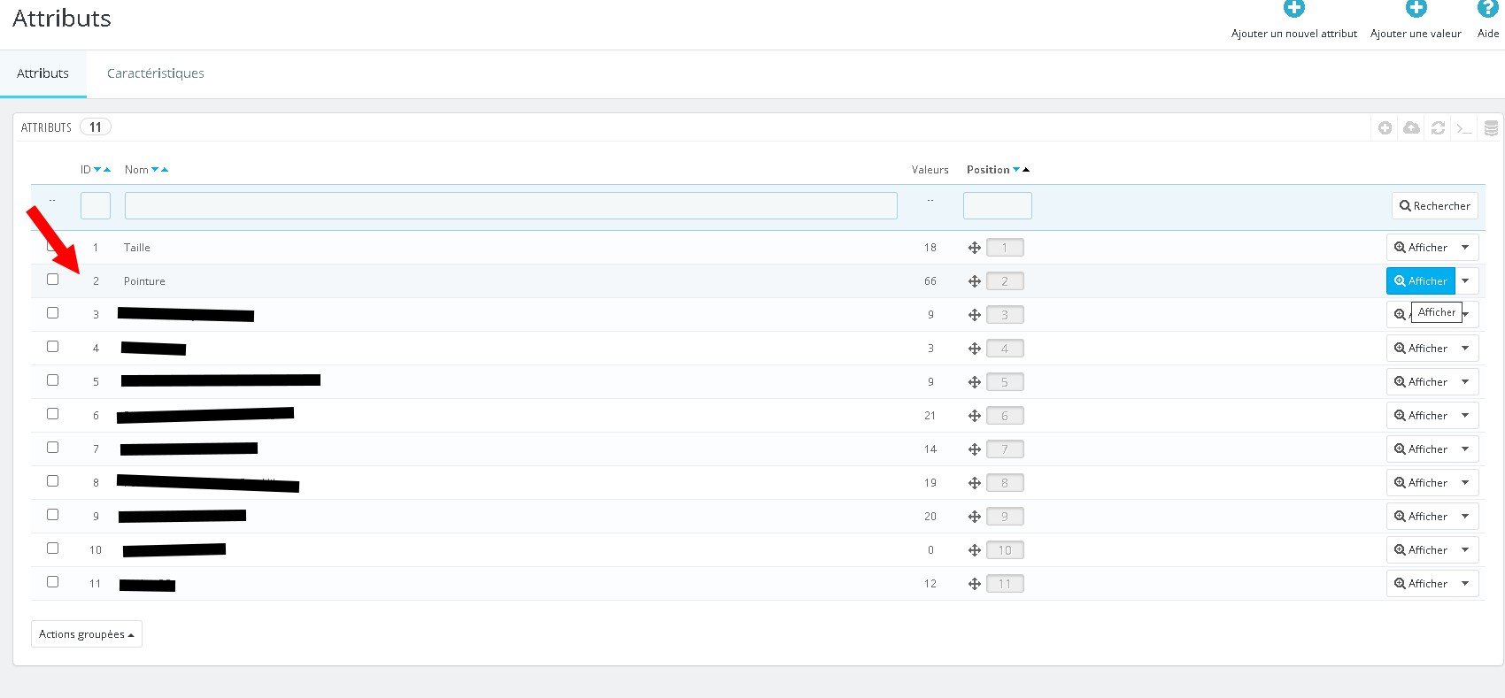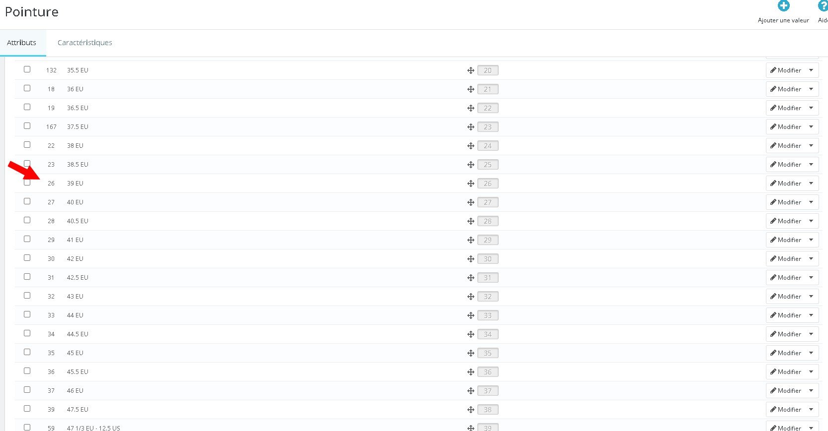 Backoffice "Attributs & Caractéristiques" > "Pointure (ID 2) " > "39 EU (ID 26)
