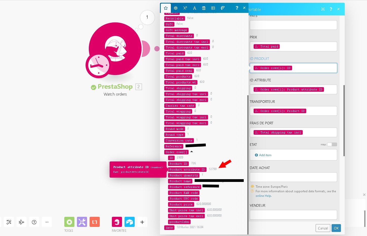 limitedshop Posted February 11, 2021 Share Posted February 11, 2021 Bonjour, J'ai un problème au niveau des attributs/déclinaisons produits Je souhaite relier mes commandes Prestashop à une autre solution via Integromat, cependant les données ID attribute ne correspondant pas de Prestashop à Integromat. Exemple : la pointure (déclinaison) 39 EU correspondant à l'ID 26 dans back-office prestashop "attributs" > "pointures", le problème est que Integromat renvoie l'ID 12799 Vous pouvez le constater en photos ci-dessous. Le chemin pour arriver à l'attribut pointure 39 EU est le suivant : Backoffice "Attributs & Caractéristiques" > "Pointure (ID 2) " > "39 EU (ID 26) J'ai cru que le problème pouvait provenir d'Integromat, mais j'ai essayé avec Zapier et c'est exactement le même problème, cela vient donc de Prestashop. Par ailleurs j'ai également remarqué que le champ "nom du produit" était composé du nom du produit / attribut / attribut sélectionné. J'aimerais donc savoir à quoi correspond ce fameux "12799" et si quelqu'un a une solution à ce problème notamment un module qui permettrait de réaliser cette correction de correspondance ? Merci d'avance Bonne fin de journée, Link to comment Share on other sites More sharing options...