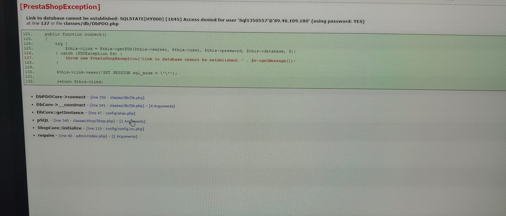 In ogni caso, l'errore sul backend "An exception occured in driver: SQLSTATE[HY000] [1045] Access denied for user'Sql1350557'@'89.46.109.184' (using password: YES)" continua ad essere un problema di connessione al DB, l'errore sul frontend, come dice anche @joseantgv è dato dal modulo ets_payment.