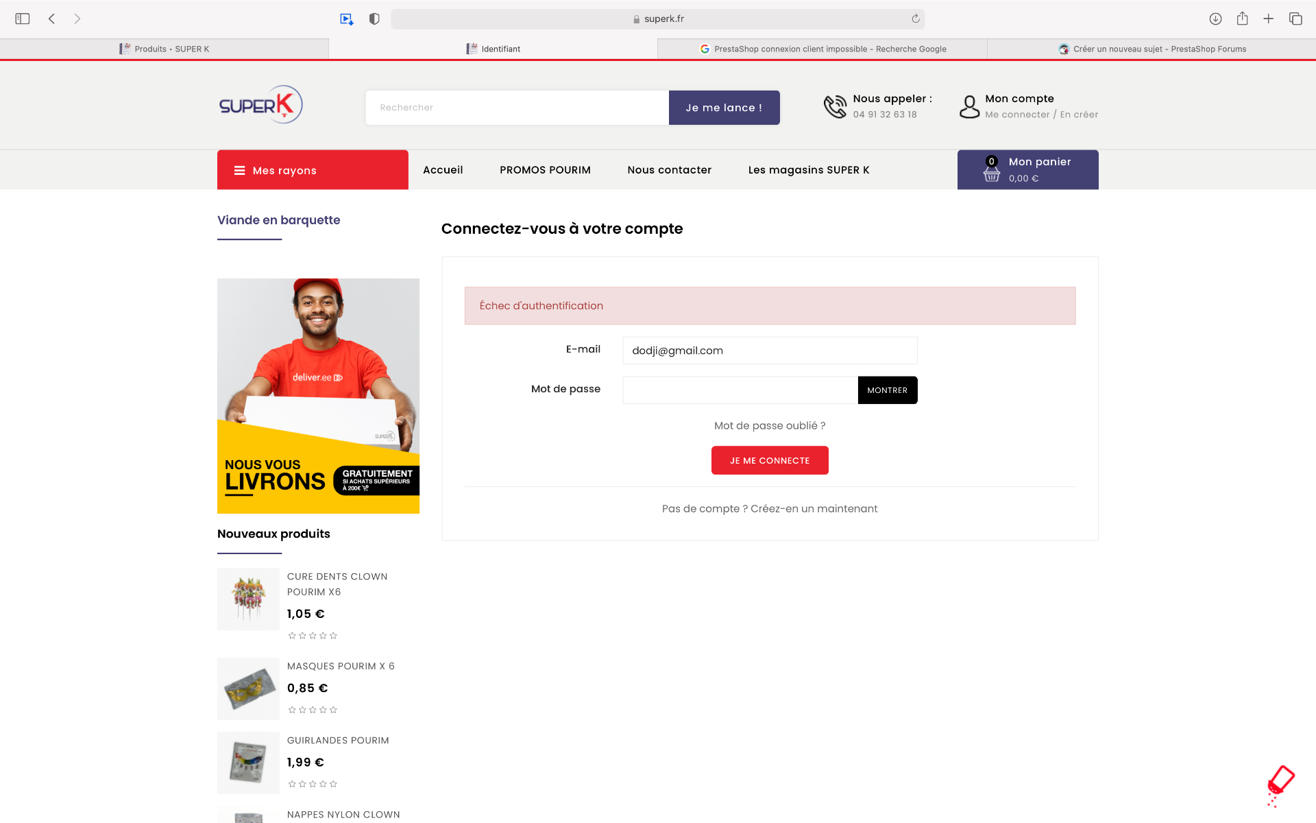 [email protected] Posted February 13, 2021 Share Posted February 13, 2021 Bonjour à tout le monde ! Je gère le site www.superk.fr. J'ai fait un essai de site multiboutique. Et depuis que j'ai fait machine arrière et suis revenu sur un site NON multiboutique, mes anciens clients n'arrivent plus à se connecter. Il y a le message "Échec d'authentification" qui apparaît à chaque fois que les clients essaient de se connecter. J'ai vraiment besoin d'aide pour résoudre ce problème. AIDEZ-MOI SVP !!!! Link to comment Share on other sites More sharing options...