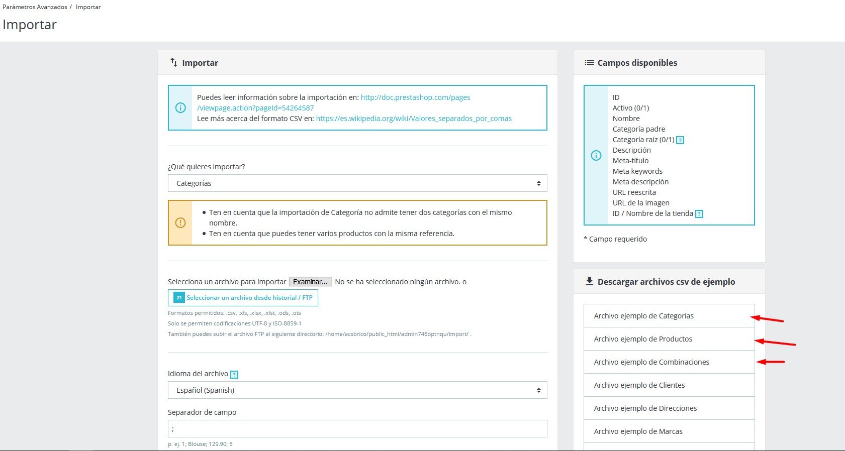 JavierP Posted February 16, 2021 Share Posted February 16, 2021 hace 1 hora, RaulRV dijo: Buenas tardes/noches, estoy preparando la importación de mis productos de nueva temporada, y tengo una duda, si importo los productos a través de excel, cómo sabe prestashop a qué categoría debe ir cada producto? es decir, por ejemplo, tengo vestidos de invierno, y quiero subir de verano, la categoría se llama igual, cómo sé o qué debo hacer para que cada producto vaya a la categoría correcta, en este caso, verano>vestidos Espero haberme expresado bien, un saludo! Buenas noches @RaulRV prestashop desde la pestaña de importaciónes te facilita ejemplos de como tienes que poner la ruta de la categoría en cada caso. Te adjunto esta captura Desde ahí pinchas y se descargan los ejemplos de cada cosa. Link to comment Share on other sites More sharing options...