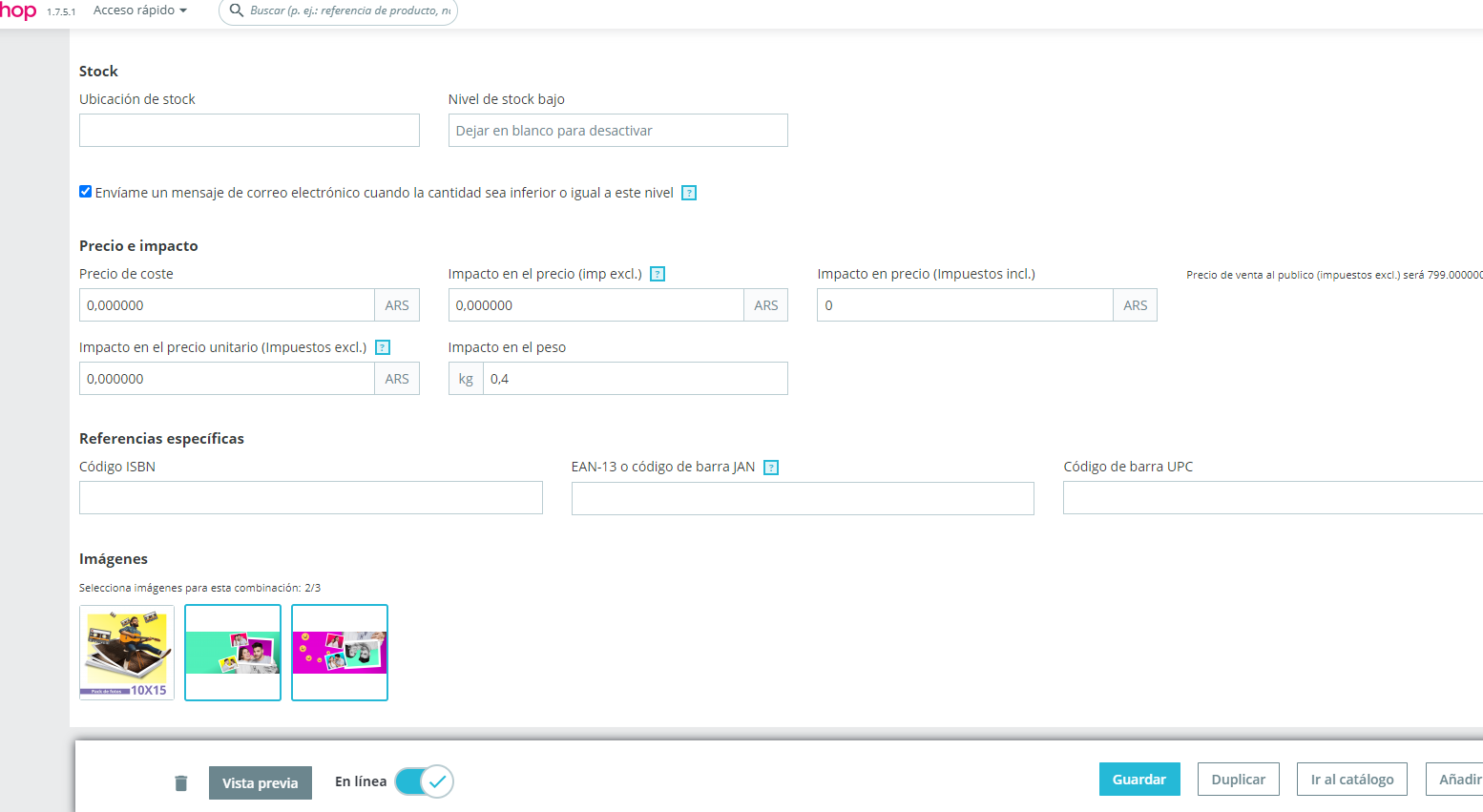 Mer82 Posted February 18, 2021 Author Share Posted February 18, 2021 Gracias! Envío imagenes Back: Y luego en la página: Y en el interior del producto: La imagen de fondo de las combinaciones tendría que ser la segunda que se encuentra en el back. Y en el slide debería de mostrar la tercera. Pero me muestra lo siguiente: y al hacer click en el slide si me muestra las demás de esta forma: Gracias! Sdos Link to comment Share on other sites More sharing options...