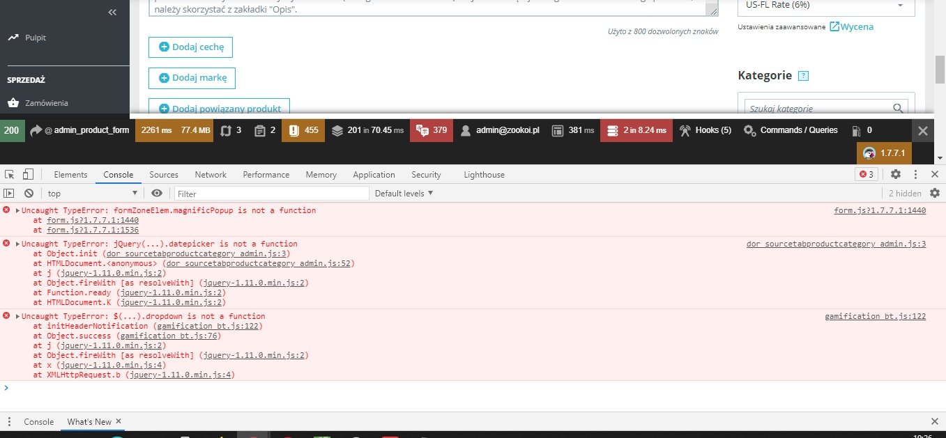mam problem z działaniem zaplecza. Nie działają poprawnie część kontrolek w zapleczu presty. W konsoli mam błędy -> w załączniku zrzut.