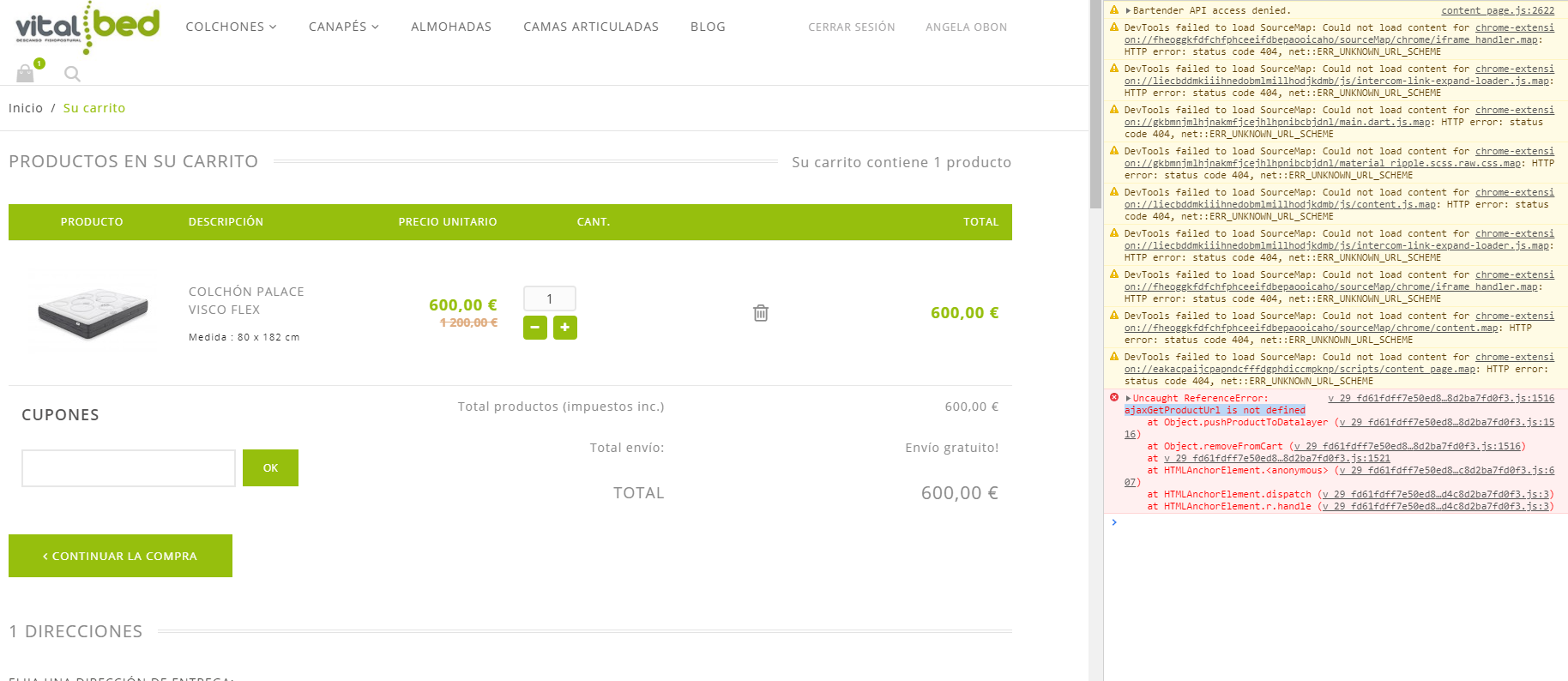 Angela33333 Posted February 23, 2021 Share Posted February 23, 2021 Hola, Estamos actualizando la plantilla de la tienda y haciendo una prueba de compra hemos visto que, se pueden eliminar productos del carrito desde la vista previa pero no desde la página del carrito. En la consola me salta este error, pero no sé cómo solucionarlo. Si podéis decirme cómo os lo agradecería mucho. Dejo por aquí también el código de error: v_29_fd61fdff7e50ed889bd4c8d2ba7fd0f3.js:1516 Uncaught ReferenceError: ajaxGetProductUrl is not defined at Object.pushProductToDatalayer (v_29_fd61fdff7e50ed889bd4c8d2ba7fd0f3.js:1516) at Object.removeFromCart (v_29_fd61fdff7e50ed889bd4c8d2ba7fd0f3.js:1516) at v_29_fd61fdff7e50ed889bd4c8d2ba7fd0f3.js:1521 at HTMLAnchorElement.<anonymous> (v_29_fd61fdff7e50ed889bd4c8d2ba7fd0f3.js:607) at HTMLAnchorElement.dispatch (v_29_fd61fdff7e50ed889bd4c8d2ba7fd0f3.js:3) at HTMLAnchorElement.r.handle (v_29_fd61fdff7e50ed889bd4c8d2ba7fd0f3.js:3) Gracias PD la web ahora está en mantenimiento Link to comment Share on other sites More sharing options...