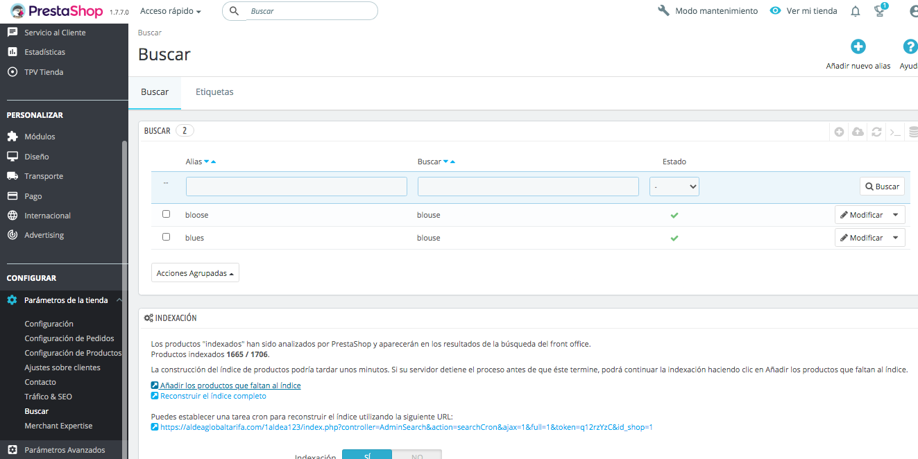 Aldeag Posted February 25, 2021 Share Posted February 25, 2021 Mira a ver si en el panel izquierdo Configurar -> Parámetros de la Tienda -> Buscar -> Reconstruir el índice completo. Y a ver si así te reconoce los artículos en el buscador Link to comment Share on other sites More sharing options...