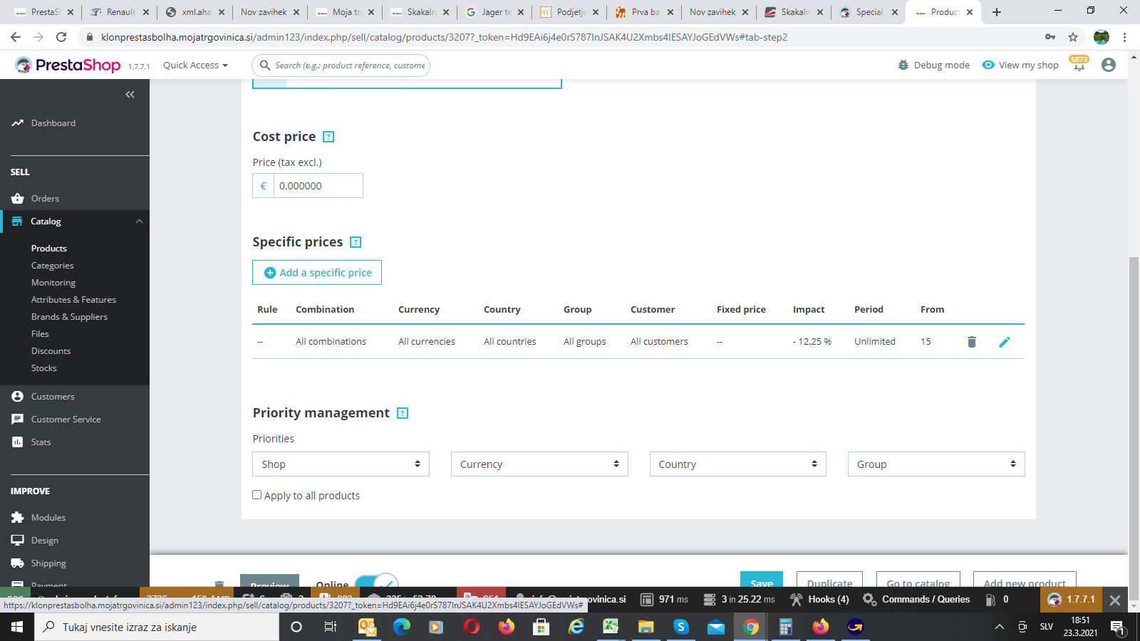 Bocco Posted March 1, 2021 Share Posted March 1, 2021 Prestashop 1.7.7.1 Artikel s posebno ceno glede na količino. Pravilno bi moralo biti: Redna cena 4.9€ / enoto. Akcjiska cena pri nakupu količine15: 4.3 € /enoto Strošek dostave 3.5€ Torej je pravilna kalkulacija pri količini 15: 15x 4.3 = 64.5€ z DDV dostava: 3.5 € z DDV DDV že vključen skupaj: 12.26 € cena skupaj z DDV 68€ Prestashop pa mi napačno kalkulira: 15 Izdelkov 64,50 € Dostava Z DDV 3,50 € Vpišite kodo za popust Cena Skupaj (Z DDV) 68,00 € DDV (Že Vključen) 12,33 € Kot je razvidno bi moral biti pravilen ddv 12.26, prestashop pa ga izračuna 12.33. Sicer pri normalnih cenah te težave z ddv-jem nisem opazil. Pozna kdo rešitev? Link to comment Share on other sites More sharing options...