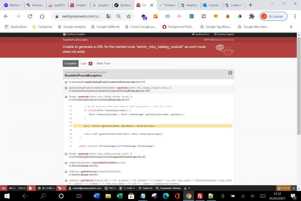 Joël Gaujard Posted March 10 Share Posted March 10 Thanks @El Patron for your reply very complete (can you share which IA generated this pretty text please?) I try different solutions but it's not working for me. I tried to install ps_mbo module from GitHub but I have another error which is a little bit different (there are an underscore at the beginning of the route name): An exception has been thrown during the rendering of a template ("Unable to generate a URL for the named route "_admin_mbo_catalog_module" as such route does not exist."). Thanks for your help Link to comment Share on other sites More sharing options...