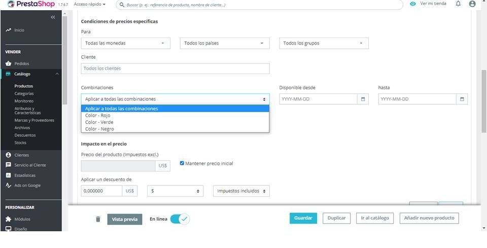 IreneMD Posted March 9, 2021 Share Posted March 9, 2021 Buenos días, He añadido varios productos a mi web que tienen distintos atributos. Como es una web de venta de móviles, los atributos pueden ser el color, los GB, etc. Mi duda es que quiero de vez en cuando hacer ofertas en determinados artículos pero no encuentro la manera de ver en "precio específico" el apartado que te permite elegir en qué combinación quieres poner esa rebaja o si lo quieres en todas. En la imagen que adjunto, es de un manual de la versión 1.6 pero en la 1.7 que estoy usando yo no veo nada de eso. Pasa de el apartado de "cliente" a las fechas en las que quieres que esté operativa esa rebaja. Me gustaría saber si es posible poder poner una rebaja en un solo atributo de esas combinaciones. Es decir, que si se puede elegir entre la versión roja o verde, al clicar en verde, veas que SOLO ESA OPCIÓN tiene la rebaja que yo quiero. Quedo atenta y muchas gracias por leerme, Irene Link to comment Share on other sites More sharing options...