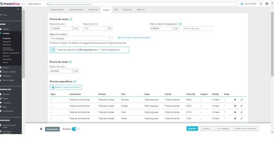 Macu Posted March 15, 2021 Share Posted March 15, 2021 Hola IreneMD Pero en Prestashop 1.7.x.x. si se puede establecer precios por combinaciones, en la misma ficha de precios se encuentra. Puedes establecer un precio para cada País, región, etc. y combinación o le puedes dar un descuento porcentual, en cualquiera de las dos formas puedes realizarlo Link to comment Share on other sites More sharing options...