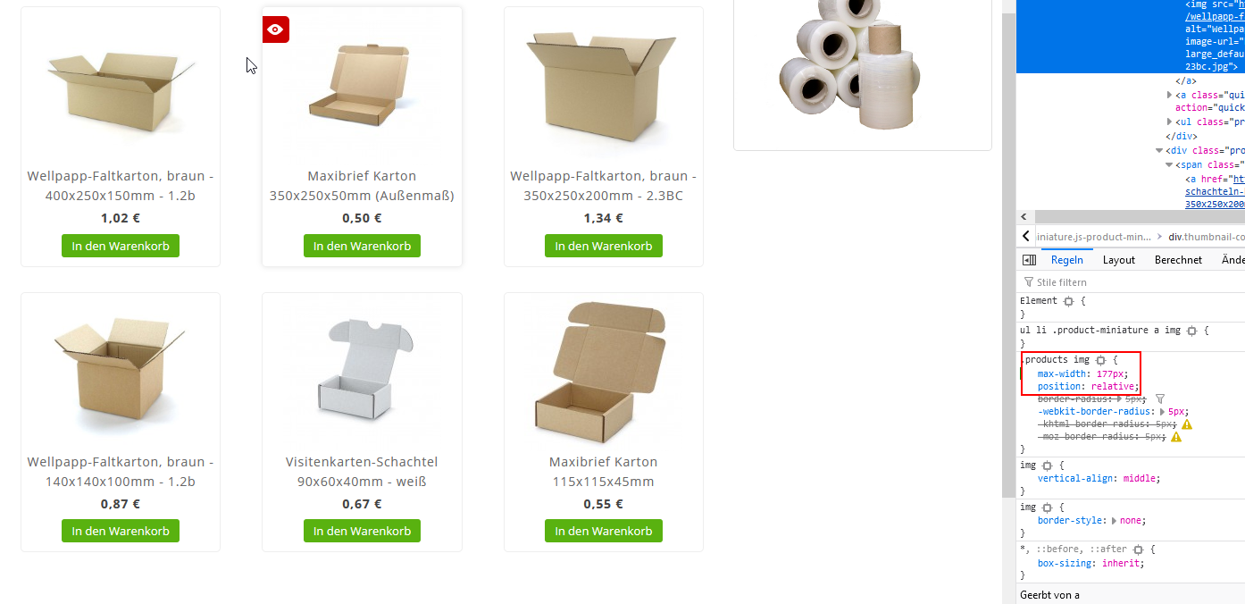 JBW Posted March 10, 2021 Share Posted March 10, 2021 Du hast Bilder mit 177x177px und 250x250px - wahrscheinlich hast du das Format mal geändert? Wenn ja müssen die Bilder neu generiert werden (Design->Bilder). Du kannst die Größe auch in deiner custom.css wieder auf 177 limitieren, dann sind auch die größeren genauso klein wie die anderen: .products img { max-width: 177px; } Link to comment Share on other sites More sharing options...
