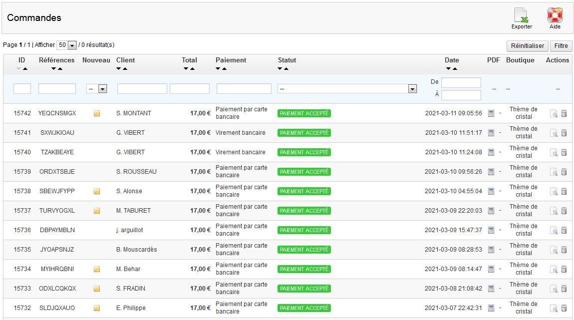 Briez Agnès Posted March 11, 2021 Share Posted March 11, 2021 Bonjour, Si quelqu'un a déjà rencontré ce problème, merci de votre aide, Site sous prestashop 1.5.4 qui existe depuis 2015, et depuis quelques jours, sur la liste des commandes et des clients dans le back office, je n'ai plus qu'une seule page alors que je devrais en avoir plusieurs centaines puisque je devrais visualiser tous l'historique. Voir image ci jointe de la page commande et idem pour la page client, je ne vois plus le nombre total de commandes qui reste à 0 et je n'ai plus accès aux autres pages, seule possibilité, afficher plus de clients dans la page en augmentant le nombre par page. Link to comment Share on other sites More sharing options...