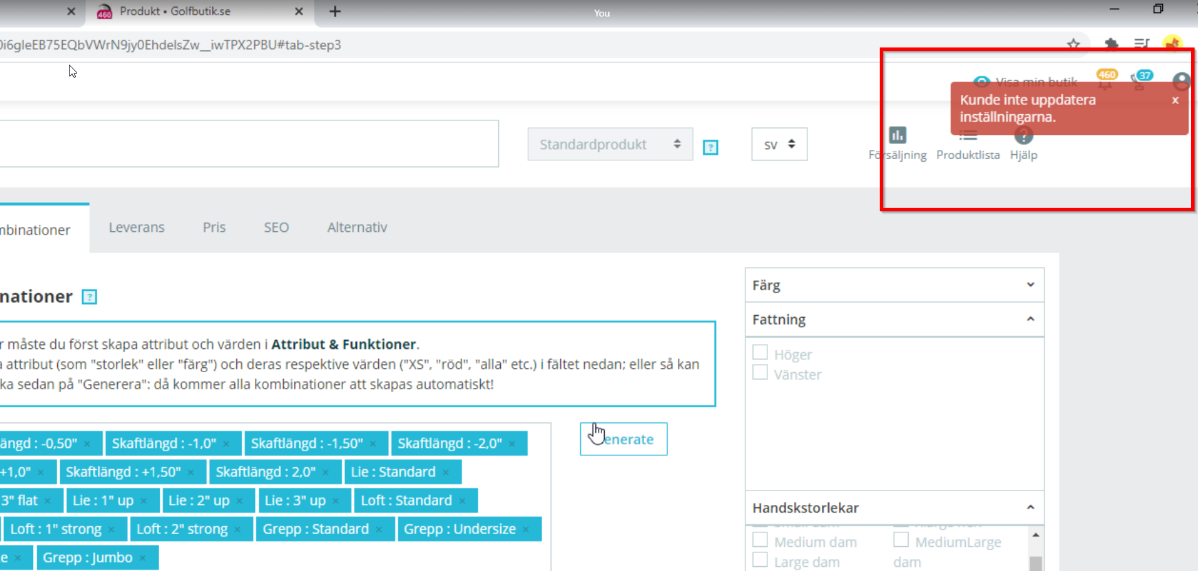 patrik1972 Posted March 14, 2021 Share Posted March 14, 2021 Hi, I try to generate combinations of the following, but nothing happens, no combinations are created. If I then click save on the product, I get a error. Then I go back to product list and try to edit, then I get a 500? Link to comment Share on other sites More sharing options...