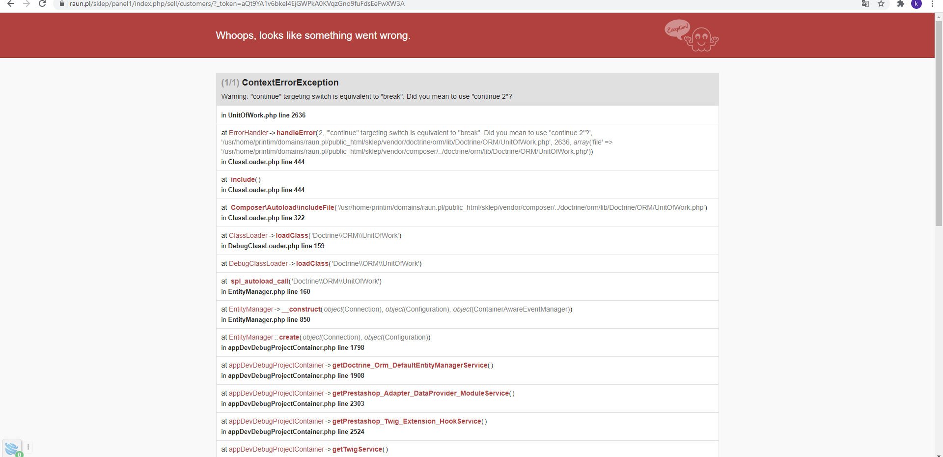 Witam, po krótce opiszę sytuację. Serwer na którym stoi sklep jest ten sam, baza ta sama. Zmieniła się jedynie domena. Zmieniłem wpisy w bazie i wyczyściłem cały cache z katalogu var/cache. Front sklepu działa, niestety nie mogę zalogować się do panelu. Po włączeniu debugowania w panelu otrzymujemy komunikat jak w załączniku. Będę wdzięczny za pomoc lub wskazówki. Prestashop 1.7.6.0 php 7.3. Wersja php nie była zmieniana przy zmianie domeny. https://raun.pl/sklep/panel1/ Chciałbym jeszcze dodać że po powrocie na starą domenę wszystko działa ok.