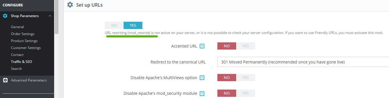 It's written: "URL rewriting (mod_rewrite) is not active on your server, or it is not possible to check your server configuration". But "YES" is on. So I don't know if it concerns the subject: