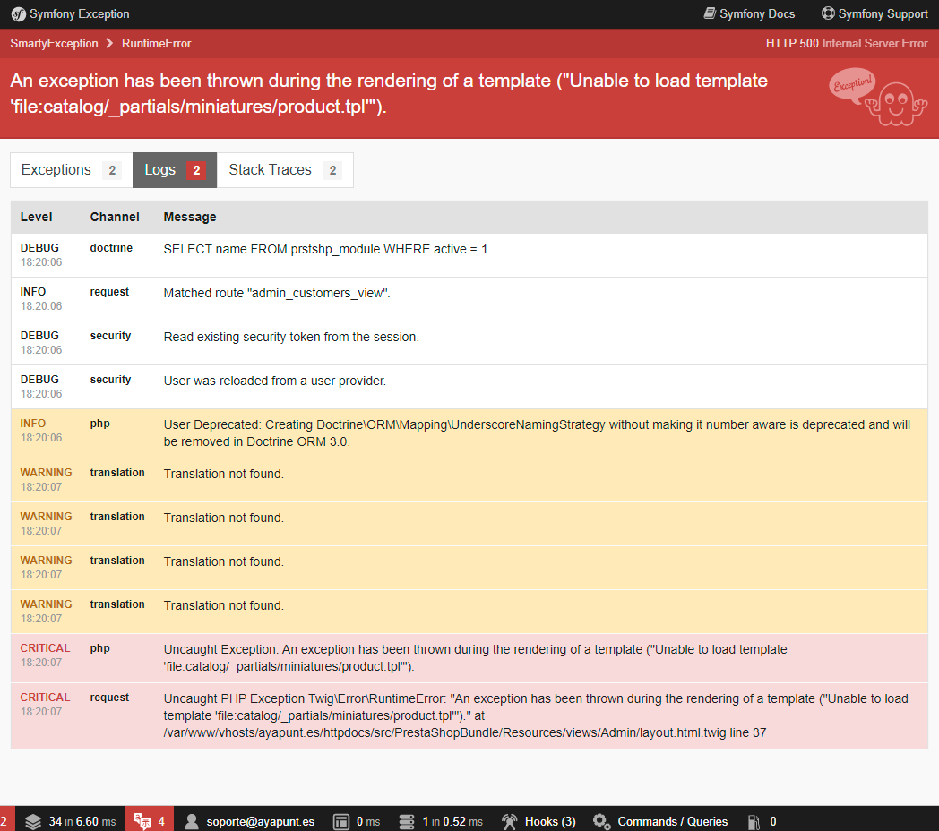 GEOCE Posted March 24, 2021 Author Share Posted March 24, 2021 LevelChannelMessage DEBUG23:43:56doctrineSELECT name FROM prstshp_module WHERE active = 1 INFO23:43:56requestMatched route "admin_customers_edit". DEBUG23:43:56securityRead existing security token from the session. DEBUG23:43:56securityUser was reloaded from a user provider. INFO23:43:56phpUser Deprecated: Creating Doctrine\ORM\Mapping\UnderscoreNamingStrategy without making it number aware is deprecated and will be removed in Doctrine ORM 3.0. WARNING23:43:56translationTranslation not found. WARNING23:43:56translationTranslation not found. WARNING23:43:56translationTranslation not found. WARNING23:43:57translationTranslation not found. CRITICAL23:43:57phpUncaught Exception: An exception has been thrown during the rendering of a template ("Unable to load template 'file:catalog/_partials/miniatures/product.tpl'"). CRITICAL23:43:57requestUncaught PHP Exception Twig\Error\RuntimeError: "An exception has been thrown during the rendering of a template ("Unable to load template 'file:catalog/_partials/miniatures/product.tpl'")." at /var/www/vhosts/ayapunt.es/httpdocs/src/PrestaShopBundle/Resources/views/Admin/layout.html.twig line 37 Link to comment Share on other sites More sharing options...