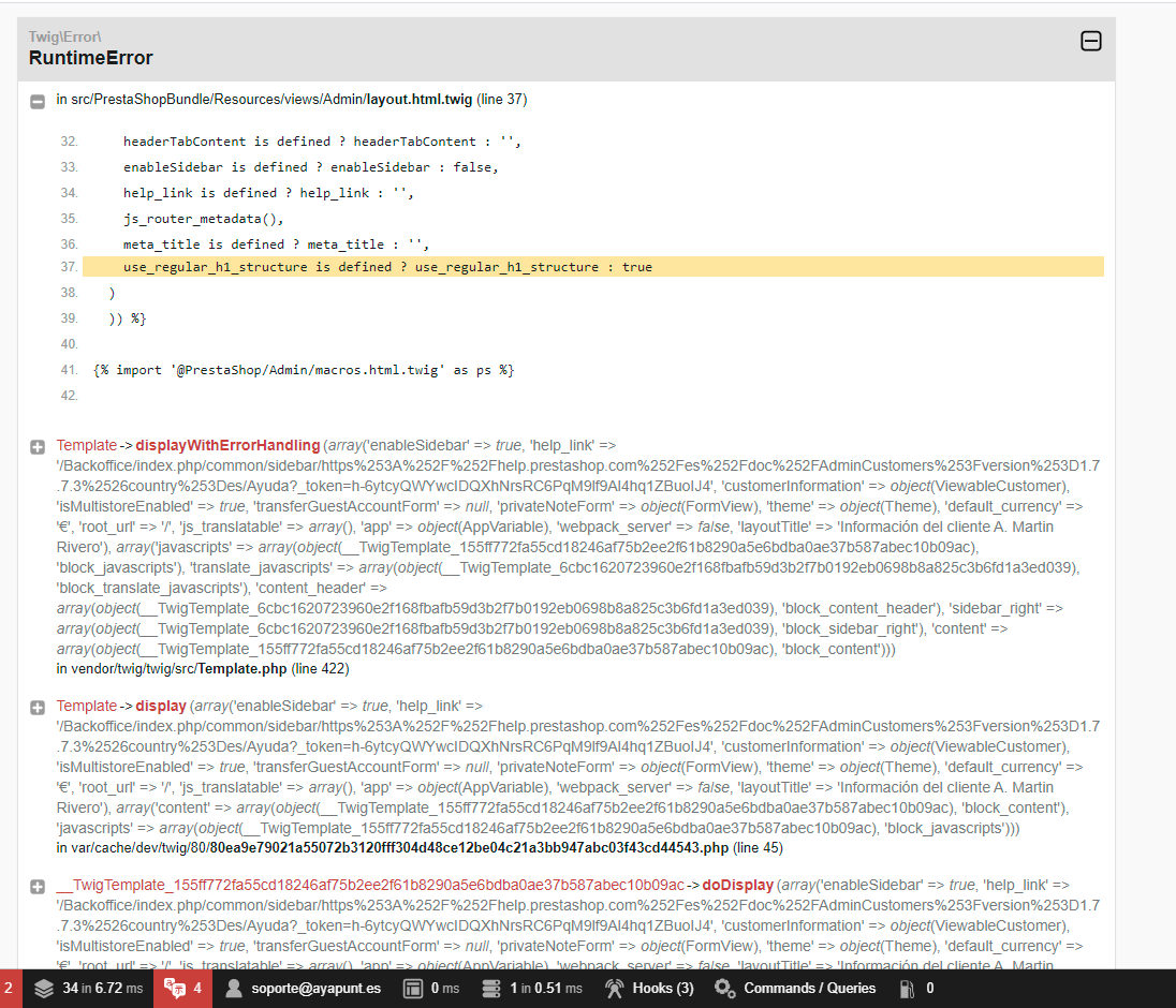 GEOCE Posted March 24, 2021 Author Share Posted March 24, 2021 Twig\Error\RuntimeError in src/PrestaShopBundle/Resources/views/Admin/layout.html.twig (line 37) headerTabContent is defined ? headerTabContent : '', enableSidebar is defined ? enableSidebar : false, help_link is defined ? help_link : '', js_router_metadata(), meta_title is defined ? meta_title : '', use_regular_h1_structure is defined ? use_regular_h1_structure : true ) )) %} {% import '@PrestaShop/Admin/macros.html.twig' as ps %} Link to comment Share on other sites More sharing options...