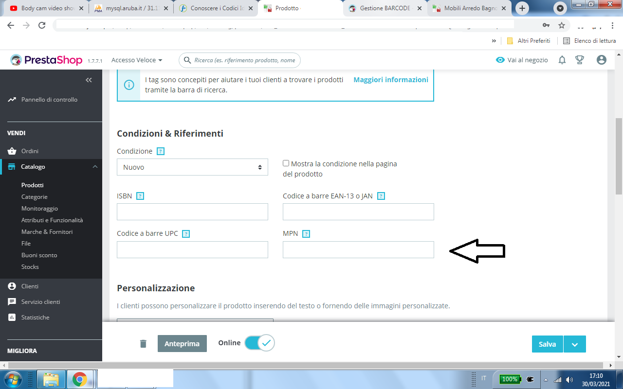 Alex.Vt Posted March 30, 2021 Share Posted March 30, 2021 1 minute ago, Bitmodel said: Grazie mille ma il campo MPN non lo trovo in Prestashop. Nella scheda articolo lo trovi su Opzioni , se usi le combinazioni invece lo trovi nella scheda della singola combinazione Link to comment Share on other sites More sharing options...