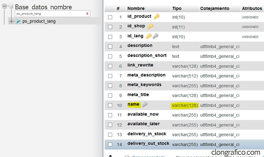 ventura Posted March 27, 2021 Share Posted March 27, 2021 Sera necesario también editar la class classes/Product.php En 'name' => array('type' => self::TYPE_STRING, 'lang' => true, 'validate' => 'isCatalogName', 'required' => false, 'size' => 128), Link to comment Share on other sites More sharing options...