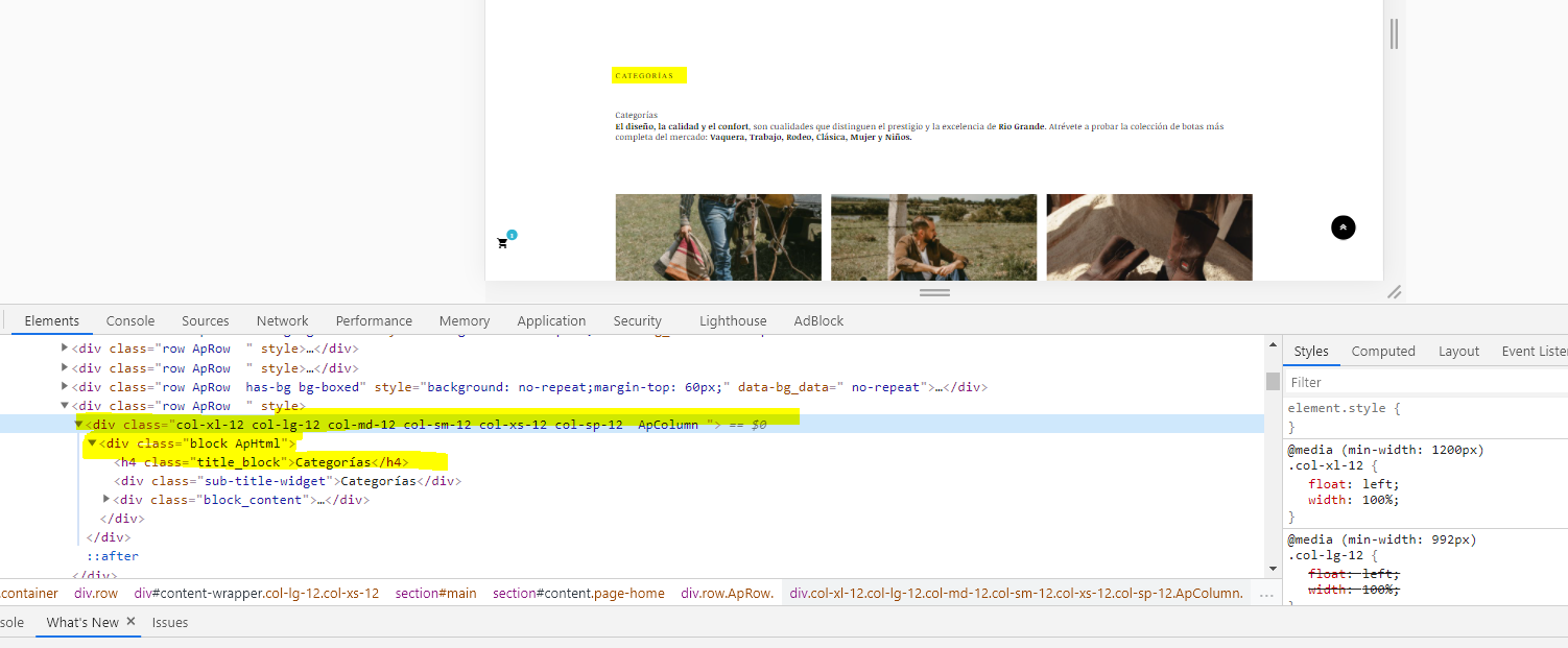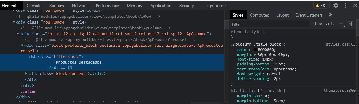 musicmaster Posted March 29, 2021 Share Posted March 29, 2021 1 hour ago, Juan Rios1 said: Thank you, can you help me how to do this with a live example? I mean I see you put "div.appagebuilder" but I don't know where you got that from My link is test.riograndeboots.com.mx Thanks in advance! Sorry, but this is basic CSS. In addition I already explained it. But I will try once more: The enclosing div has description: <div class="block products_block exclusive appagebuilder text-align:center; apProductCarousel"> "block products_block exclusive appagebuilder text-align:center; apProductCarousel" are all class names and you can use any of them for this purpose. I chose "appagebuilder" as that seemed the most specific. But I could have chosen any of them. The only risk is that there will be more than one enclosing div's with the same class name. I could also have used classes of div's higher in the hierarchy like "ApRow" BTW: the "text-align:center" shouldn't be among the classes. That is a major error. Link to comment Share on other sites More sharing options...