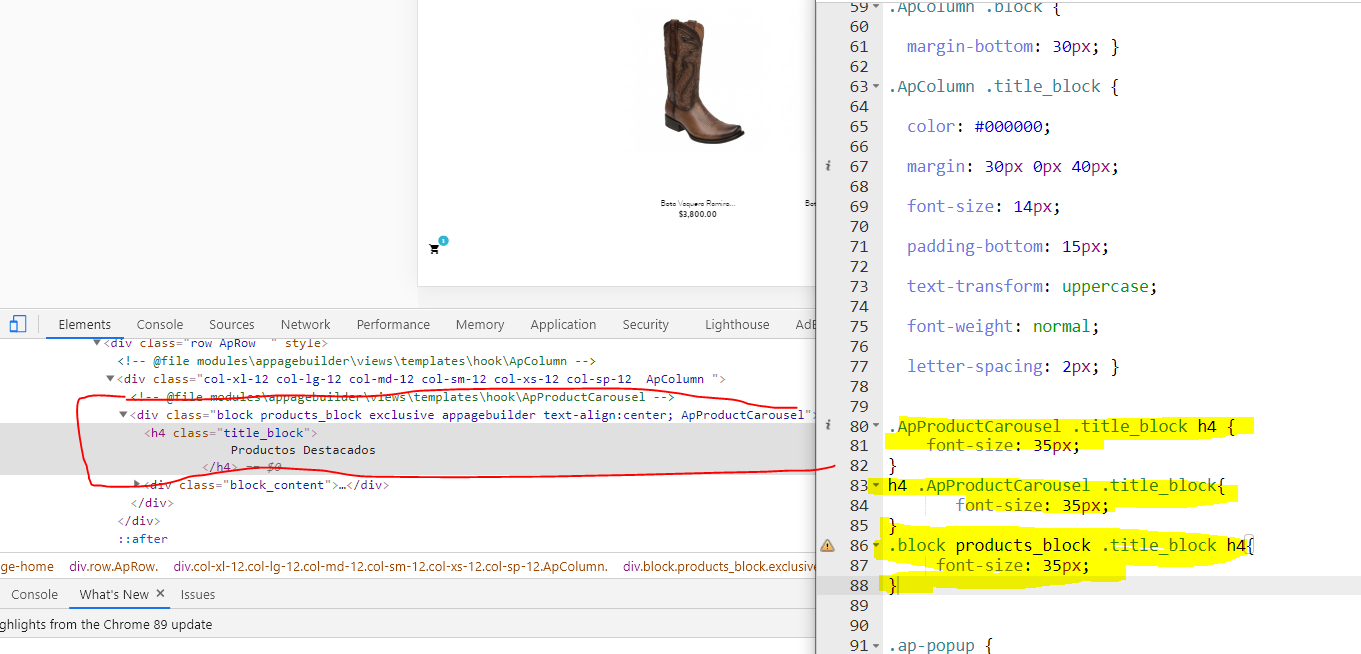 Juan Rios1 Posted March 26, 2021 Share Posted March 26, 2021 Basicly, I have some text I would like to make bigger in my homepage, but when I change it's font, some other text also change size, all the H4's in the class "title_block" change. Is there a way to change this specific H4 to a different class? I'm using prestashop 1.7 Link to comment Share on other sites More sharing options...