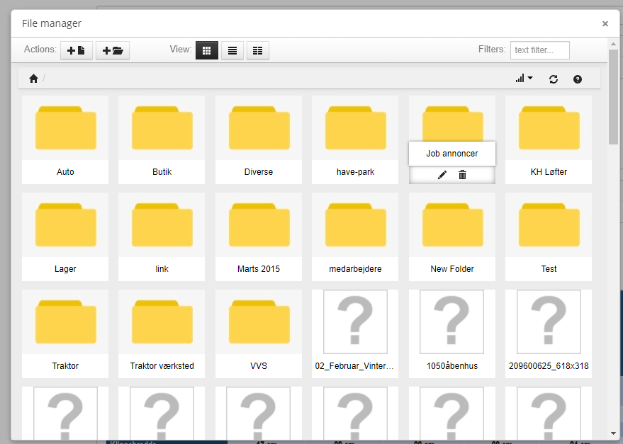 cabesc Posted March 28, 2021 Share Posted March 28, 2021 Hej! Jeg administrerer en hjemmesiden for et lokalt firma. Når jeg skal rette sider og uploade nye billeder, vises der bare et spørgsmåltegn som thumbnail, og billedet vises ikke på siden. Se billede Jeg har talt med firmaet, hvor sitet ligger, og de siger at det fungerer fint hos dem. Jeg har prøvet fra flere forskellige computere og fra forskellige browser, alle med samme problem. Siderne redigeres i Simple Blog. Billeder i webshop modulet fungerer fint Jeg er ikke super skarp til det tekniske, jeg skal bare redigere indholdet på siderne Nogle der kan komme med idéer og hints til hvad jeg skal rette Prestashop 1.6.0.7 PFT! Carsten Link to comment Share on other sites More sharing options...