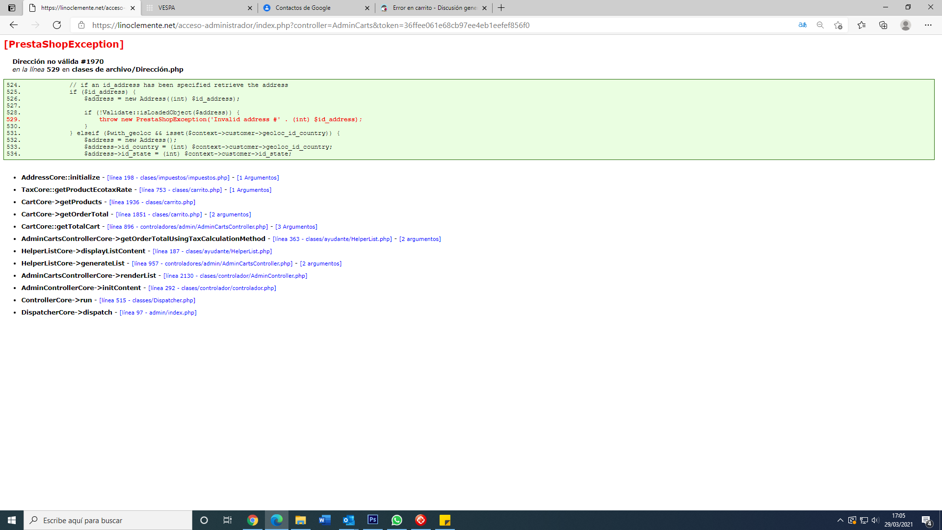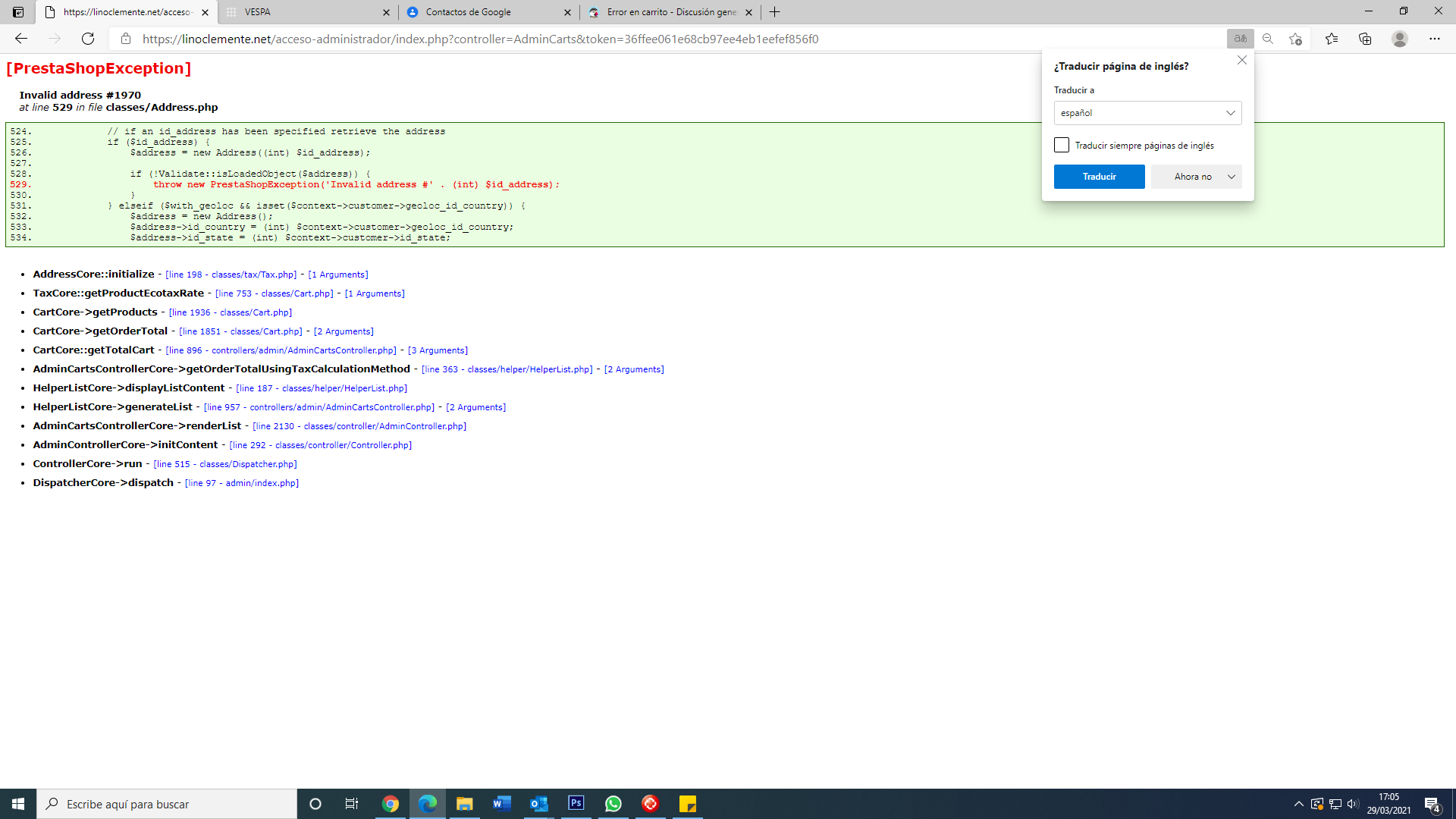 gusman126 Posted March 30, 2021 Share Posted March 30, 2021 Lo primero. Desactiva la opción de traducir en tu dominio, te traduce automaticamente los textos de ingles a español. Parece que tienes un cliente con un fallo en la dirección, algo extraño pero posible O tienes una dirección mal añadida, algo raro tambien. Entra en direcciones y comprueba una a una si se muestra el error de nuevo (recuerda desactivar la traduccion automatica) Si no deja entrar en direcciones, tendra que verse entrando en la base de datos, utilizando la herramienta PHPMYADMIN que debes tener en Cpanel o en Plesk, NO ENTRES ahi sin saber y sin tener copias Link to comment Share on other sites More sharing options...