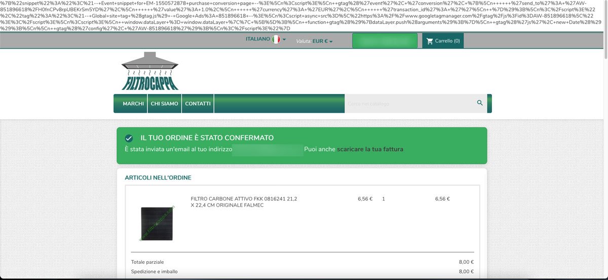 fedesib Posted April 2, 2021 Share Posted April 2, 2021 Ciao, è un pezzo del codice di monitoraggio di Google Analytics che viene mostrato invece di essere eseguito. Come hai inserito il codice di Analytics? Se è un modulo potrebbe essere quello, altrimenti potrebbe essere un errore di sintassi del tema o di qualche altro modulo che non chiude correttamente una parentesi o simile. Succede solo nella pagina di conferma ordine? Buona giornata, Federica Link to comment Share on other sites More sharing options...
