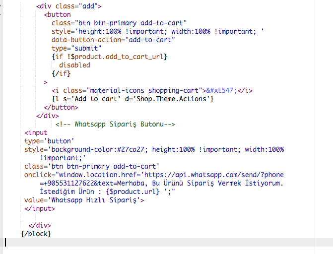 Baransel Pamuk Posted April 1, 2021 Share Posted April 1, 2021 Merhaba Arkadaşlar, Bi Proje İçin Yapmış Olduğum Whatsapp Sipariş Kodunu, Sizlerle Paylaşmak İstiyorum. <input type='button' style='background-color:#27ca27;' class='btn btn-primary add-to-cart' onclick="window.location.href='https://api.whatsapp.com/send/?phone=+905531127622&text=Merhaba, Bu Ürünü Sipariş Vermek İstiyorum. İstediğim Ürün : {$product.url} ';" value='Whatsapp Hızlı Sipariş'> </input> Ben Burada onclick Değerini Kullandım, daha sağlıklı ve güzel olacağını düşündüm. öbür türlü iki buton var ve direk sipariş sayfasına atabilir. buton şekli için bootstrap class'larından bir tane kullandım. siz isterseniz bunu değiştirebilirsiniz tabiiki. Quote product-add-to-cart.tpl Dosyasında yaptığım işlemi bıraktım. add div'i içersinde bu şekilde kullanabilirsiniz. Sağlıklı Günler Dilerim. 5 Link to comment Share on other sites More sharing options...