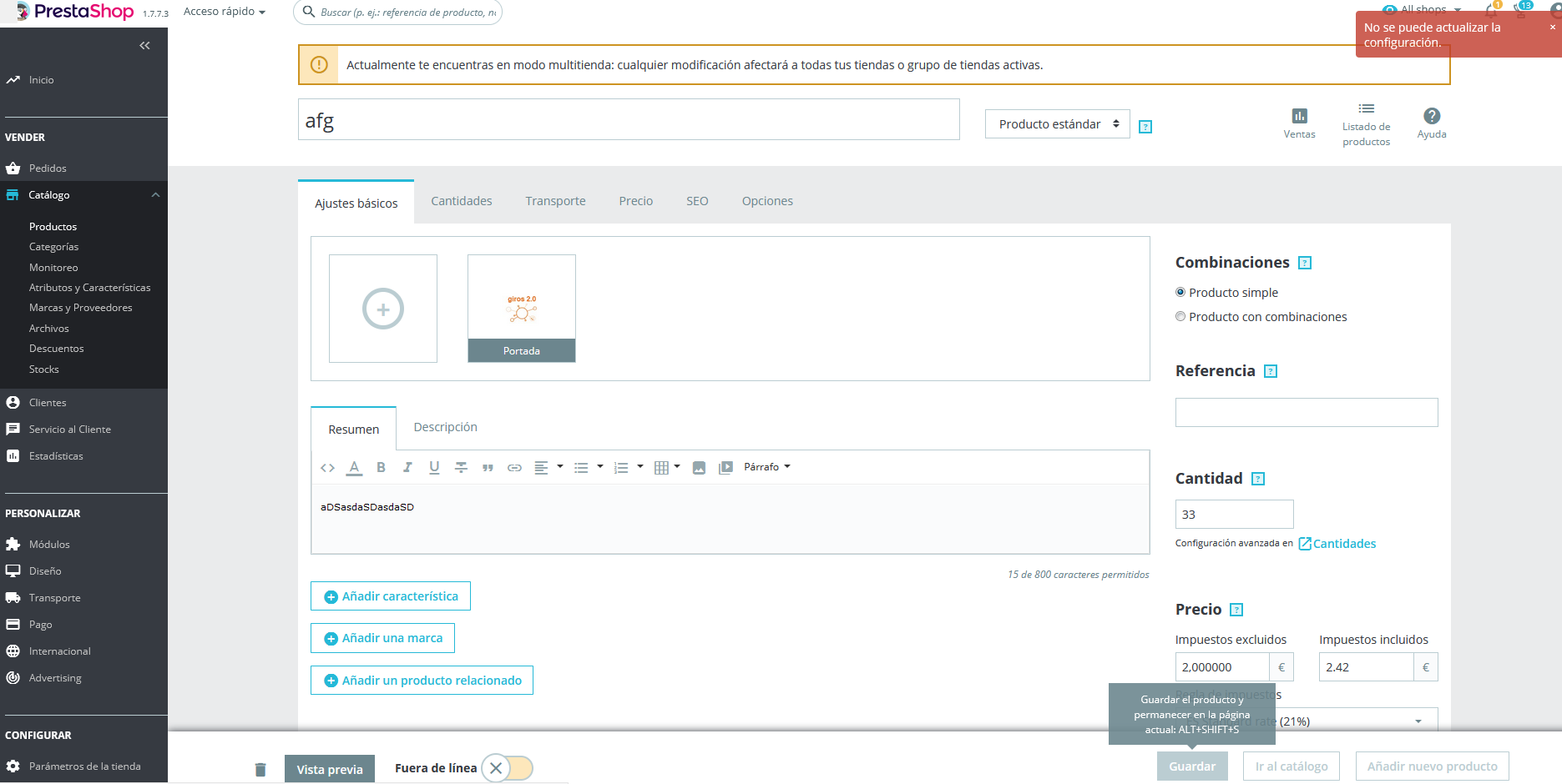 Perrotekel Posted April 5, 2021 Share Posted April 5, 2021 (edited) Hola, Despues de instalar la version ps_1_7_7_3 y migrar las categorias/productos/features/atributos a la nueva version, cuando intento crear productos me sale "No se puede actualizar la configuración." y da igual que sea un producto sencillo, con combinaciones o de otro tipo. Eso si, cuando estoy creando aunque da error al crear, si lo crea, porque posteriormente lo encuentro en el catalogo. He probado diferentes cosas que he encontrado en internet, activar cache, desactivar smarty css, actualizar el parametro PS_COOKIE_CHECKIP a "0" pero nada termina de funcionar. Alguna idea de que puede pasar? el error que salta es Uncaught SyntaxError: JSON.parse: unexpected character at line 1 column 1 of the JSON data por el theme/default//js/bundle/product/form.js?1.7.7.3:700 Gracias Edited April 5, 2021 by Perrotekel (see edit history) Link to comment Share on other sites More sharing options...