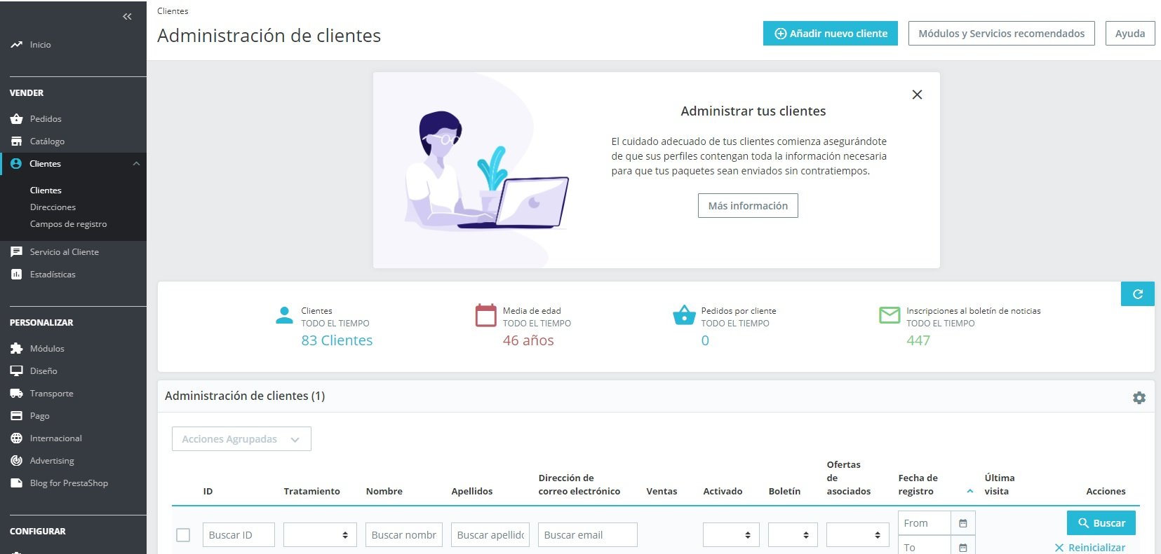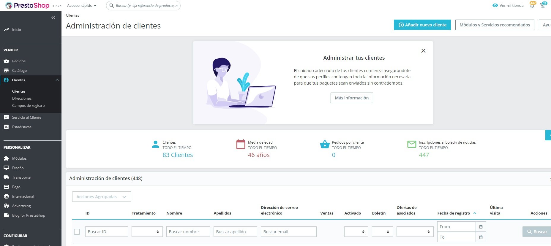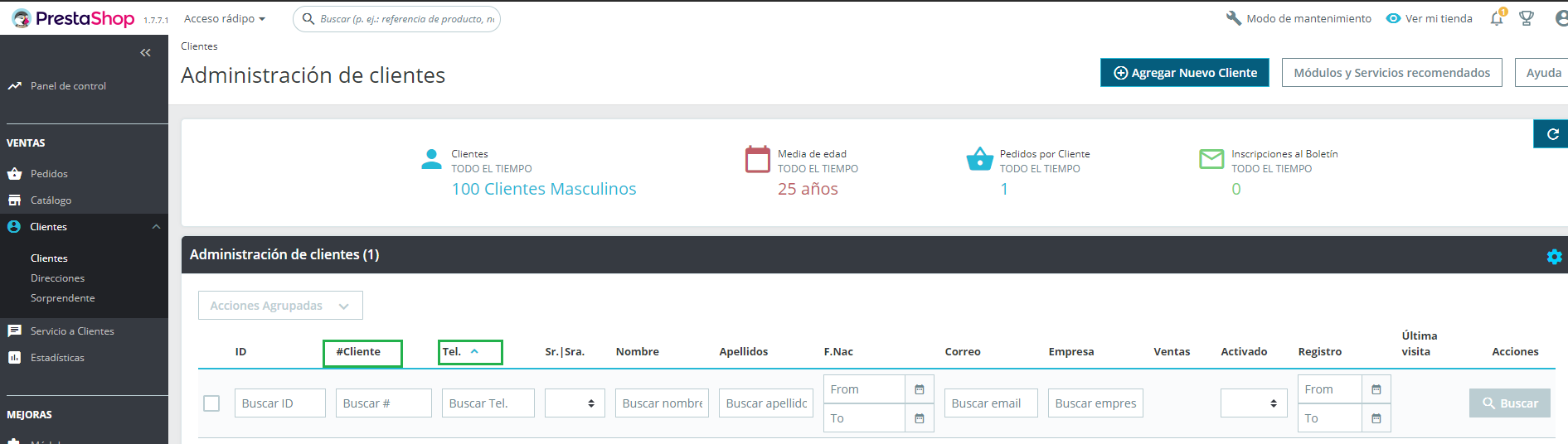 AleAlejandro Posted April 13, 2021 Share Posted April 13, 2021 hace 7 horas, victorweb dijo: @alex222er gracias!! Con el último post he conseguido mostrarlo en Ver Cliente de control panel ... Sigo sin conseguir mostrar los campos en el listado de clientes ni para modificar/editar cliente ======================== CLIENTES PANEL PRINCIPAL===================================== ##---> (se añanden los encabezados de FILTROS/BUSQUEDAS) public_html/src/Core/Grid/Definition/Factory/CustomerGridDefinitionFactory.php protected function getColumns(){ ->add( (new DataColumn('copy_phone')) ->setName($this->trans('Tel.', [], 'Admin.Global')) ->setOptions(['field' => 'copy_phone',])) ### ... otros campos } ##---> (se establecen los parametros de datos/campos de FILTROS/BUSQUEDAS) public_html/src/Core/Grid/Query/CustomerQueryBuilder.php ------- funcion -------------- public function getSearchQueryBuilder(SearchCriteriaInterface $searchCriteria) { $searchQueryBuilder = $this->getCustomerQueryBuilder($searchCriteria) ->select('c.copy_ncliente, #... otros campos ') ->addSelect('c.date_add, gl.name as social_title, s.name as shop_name, c.company'); ##... más codigo } ------- otra funcion -------------- private function applyFilters(array $filters, QueryBuilder $qb) { $allowedFilters = [ 'copy_phone', ##otros campos.. ]; ------- otra funcion -------------- private function applySorting(QueryBuilder $searchQueryBuilder, SearchCriteriaInterface $searchCriteria) { switch ($searchCriteria->getOrderBy()) { case 'copy_ncliente': ## otros campos ... $orderBy = 'c.' . $searchCriteria->getOrderBy(); ##más codigo... } ##---> (se establecen los parametros de datos/campos de EXPORTACION DE DATOS CLIENTES) public_html/src/PrestaShopBundle/Controller/Admin/Sell/Customer/CustomerController.php -------- funcion ---------- public function exportAction(CustomerFilters $filters) { $filters = new CustomerFilters(['limit' => null] + $filters->all()); $gridFactory = $this->get('prestashop.core.grid.factory.customer'); $grid = $gridFactory->getGrid($filters); $headers = [ 'copy_ncliente' => $this->trans('#Cliente', 'Admin.Global'), ## otros campos .... ]; $data = []; foreach ($grid->getData()->getRecords()->all() as $record) { $data[] = [ 'copy_phone' => $record['copy_phone'], ## ottos campos ... ]; } ## más codigo } NOTA: las modificaciones son en cada método o función, de igual manera utilicé el mismo nombre de variable copy_phone 1 Link to comment Share on other sites More sharing options...