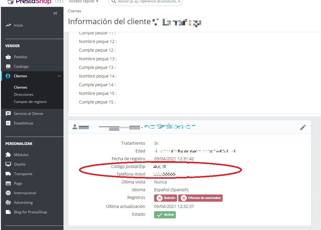 AleAlejandro Posted April 9, 2021 Share Posted April 9, 2021 hace 8 horas, victorweb dijo: Gracias @alex222er !!, soy nuevo con esto de presta y de los pocos overrides que he hecho nunca han sido de la parte nueva con Symfony o sería directamente en estos ficheros que indicas?? ... tienes algún tutorial o algo para que vaya metiendo mano al asunto? es para no marearte mucho con esto .. Por ejemplo, he intentado mostrar los datos en el panel de cliente (añadi 2 campos zipcode y phonemobile se llaman igual en la tabña ps_customer) : 1 - public_html/src/Core/Domain/Customer/QueryResult/PersonalInformation.php he añadido a la clase : class PersonalInformation { /** * @var string */ private $zipcode; /** * @var string */ private $phonemobile; public function __construct( $firstName, $lastName, $zipcode, $phonemobile, $email, $isGuest, $socialTitle, $birthday, $registrationDate, $lastUpdateDate, $lastVisitDate, $rankBySales, $shopName, $languageName, Subscriptions $subscriptions, $isActive ) { $this->firstName = $firstName; $this->lastName = $lastName; $this->zipcode = $zipcode; $this->phonemobile = $phonemobile; $this->email = $email; $this->isGuest = $isGuest; $this->socialTitle = $socialTitle; $this->birthday = $birthday; $this->registrationDate = $registrationDate; $this->lastUpdateDate = $lastUpdateDate; $this->lastVisitDate = $lastVisitDate; $this->rankBySales = $rankBySales; $this->shopName = $shopName; $this->languageName = $languageName; $this->subscriptions = $subscriptions; $this->isActive = $isActive; } /** * @return string */ public function getzipcode() { return $this->zipcode; } /** * @return string */ public function getphonemobile() { return $this->phonemobile; } } 2- public_html/src/Adapter/Customer/QueryHandler/GetCustomerForViewingHandler.php final class GetCustomerForViewingHandler implements GetCustomerForViewingHandlerInterface { private function getPersonalInformation(Customer $customer) { $customerStats = $customer->getStats(); $gender = new Gender($customer->id_gender, $this->contextLangId); $socialTitle = $gender->name ?: $this->translator->trans('Unknown', [], 'Admin.Orderscustomers.Feature'); if ($customer->birthday && '0000-00-00' !== $customer->birthday) { $birthday = sprintf( $this->translator->trans('%1$d years old (birth date: %2$s)', [], 'Admin.Orderscustomers.Feature'), $customerStats['age'], Tools::displayDate($customer->birthday) ); } else { $birthday = $this->translator->trans('Unknown', [], 'Admin.Orderscustomers.Feature'); } $registrationDate = Tools::displayDate($customer->date_add, null, true); $lastUpdateDate = Tools::displayDate($customer->date_upd, null, true); $lastVisitDate = $customerStats['last_visit'] ? Tools::displayDate($customerStats['last_visit'], null, true) : $this->translator->trans('Never', [], 'Admin.Global'); $customerShop = new Shop($customer->id_shop); $customerLanguage = new Language($customer->id_lang); $customerSubscriptions = new Subscriptions( (bool) $customer->newsletter, (bool) $customer->optin ); return new PersonalInformation( $customer->firstname, $customer->lastname, $customer->zipcode, $customer->phonemobile, $customer->email, $customer->isGuest(), $socialTitle, $birthday, $registrationDate, $lastUpdateDate, $lastVisitDate, $this->getCustomerRankBySales($customer->id), $customerShop->name, $customerLanguage->name, $customerSubscriptions, (bool) $customer->active ); } } 3 - public_html/src/PrestaShopBundle/Resources/views/Admin/Sell/Customer/Blocks/View/personal_information.html.twig <div class="card customer-personal-informations-card"> <h3 class="card-header"> <i class="material-icons">person</i> {{ customerInformation.personalInformation.firstName }} {{ customerInformation.personalInformation.lastName }} {{ customerInformation.personalInformation.zipcode }} {{ customerInformation.personalInformation.phonemobile }} ...... y no he conseguido que se muestre en el panel de control ... Debido a las prisas que tenía y a la falta de conocimiento de overrides y siguiendo el hilo de Victor Rodenas https://victor-rodenas.com/anadir-campos-en-el-formulario-de-registro-en-prestashop-1-7/ No hice uso de overrides en estos archivos modificados (solamente de controladores y clases) Link to comment Share on other sites More sharing options...