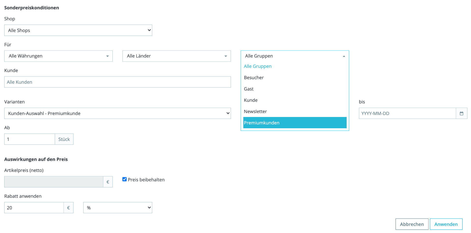 rictools Posted April 12, 2021 Share Posted April 12, 2021 vor 4 Stunden schrieb phospek: Ich bräuchte es also umgedreht. Nicht "Für welche Kundengruppe soll diese Varainte gelten?" sondern "Welche Kundengruppe soll von dieser Variante ausgeschlossen werden". Na wenn das so geht (was ich jetzt nicht weiß) wäre das ja kein Problem, die Variante gilt dann für alle Kundengruppen außer der Gruppe "Premiumkunde". Link to comment Share on other sites More sharing options...