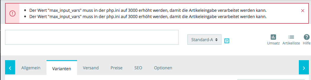 Hyginus Posted April 10, 2021 Share Posted April 10, 2021 Hello liebe Forum-Experten - ich habe die Version 1.7.7.2 und müsste die Anzahl der Varianten erhöhen (Ich kann neue Varianten anlegen, aber sie werden dann nicht generiert bzw. in der Liste rechts angezeigt). Folgende Meldung kommt: Kann mir jemand sagen, wo ich diesen Wert einstellen kann? Also wie das entsprechende Doc heißt und wo (in welchem Folder) ich es finde? Vielen Dank schon mal ... Hyginus Link to comment Share on other sites More sharing options...