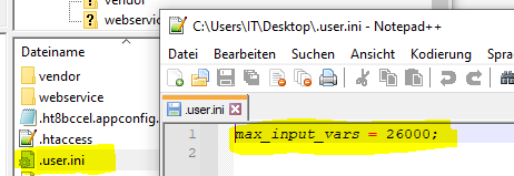 M.C Posted June 14, 2021 Share Posted June 14, 2021 (edited) Das "max_input_vars" problem habe nicht in htaccess oder php.ini ändern können so das es funktioniert hat sondern in .user.ini ! Der liegt direkt im Hauptordner im FTP. Hier einfach die .user.ini zb.mit Firezilla runterladen und mit Notepad++ öffnen.In die erste Zeile den Text max_input_vars = 26000; mit gewünschten wert eintragen (bei mir sinds 26000). Der Text: max_input_vars = 26000; Dann wieder Hochladen in den FTP und Fertig. Habe sehr lange auch das Problem gehabt und habs hiermit endgültig lösen können. Über ein + Rep würde ich freuen von allen die auch hiermit das problem Lösen können . MFG Edited June 14, 2021 by M.C (see edit history) 1 Link to comment Share on other sites More sharing options...