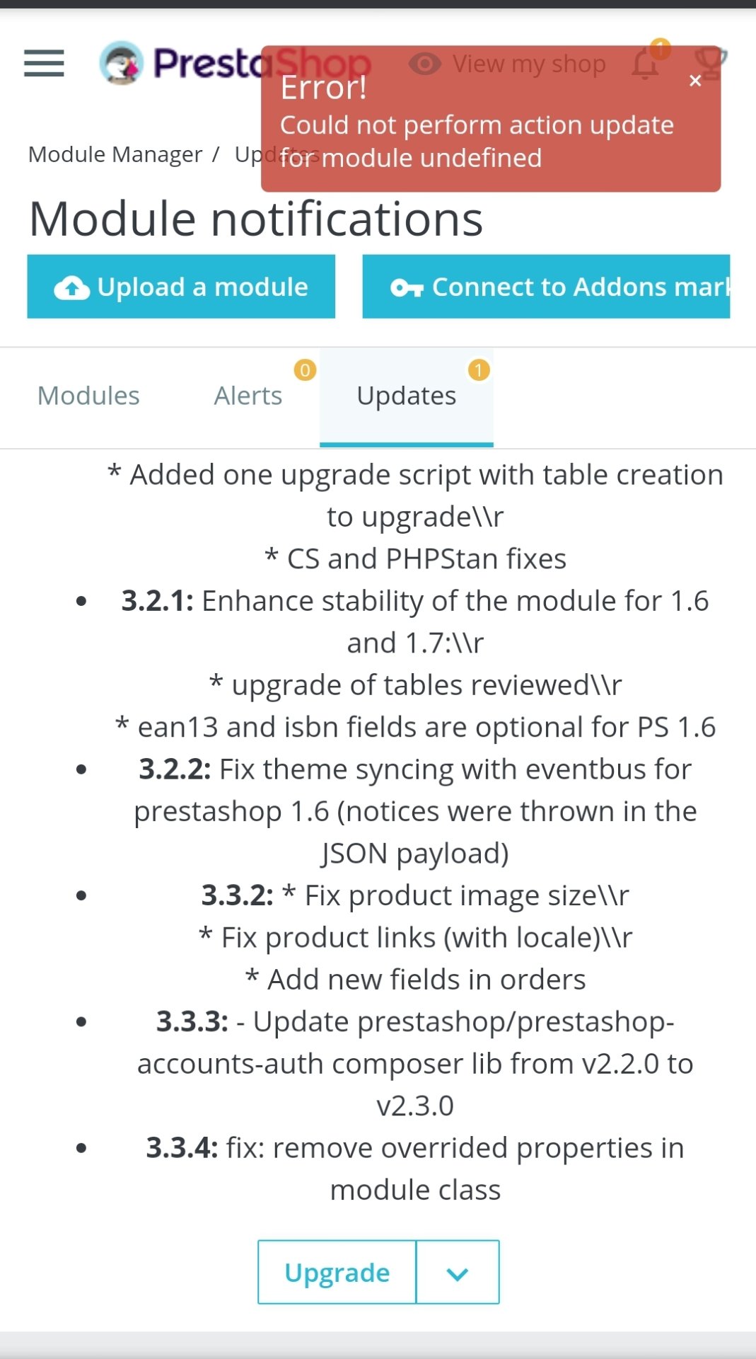 oliwil Posted April 11, 2021 Share Posted April 11, 2021 (edited) Hi I'm trying to upgrade my prestashop account module but it keeps giving me an error. Anyone knows how to fix please? Edited April 11, 2021 by oliwil SOLVED (see edit history) Link to comment Share on other sites More sharing options...