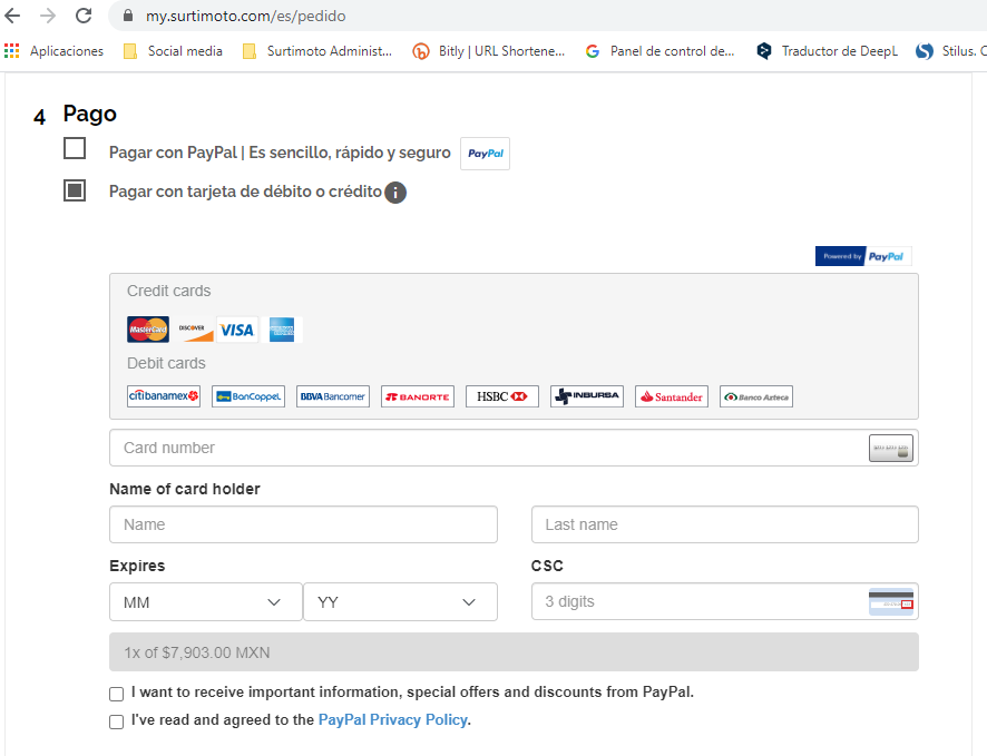 kayito Posted April 16, 2021 Share Posted April 16, 2021 Hola a todos. PayPal no carga la pasarela de pago si tengo como predeterminado el lenguaje MX que es el que necesito soy de México, si pongo cualquier otro lenguaje si funciona. Dejo las imágenes de ejemplo. Alguien me puede ayudar, ya que es necesario dejar el lenguaje MX por lo del tipo de moneda. www.my.surtimoto.com Gracias por la ayuda Link to comment Share on other sites More sharing options...