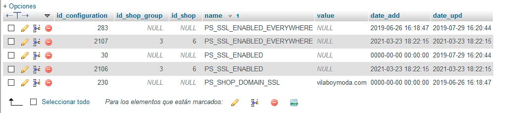 Cincotresweb Posted April 22, 2021 Author Share Posted April 22, 2021 El certificado si lo he contratado ya con el servidor. Una vez y a contratado el SSL voy a la opción multitienda y dentro del árbol de la multitienda selecciono la tienda que quiero modificar. Hago clic en modificar la que deseo y en la opción SSL vuelvo a escribir el dominio, ya he probado a escribirlo de mil maneras. Adjunto imagen. Después en parámatros de la tienda > configuración no me deja hacer clic en "Activar SSL en todas las páginas". Y si hago la prueba en "Por favor, haz clic aquí para comprobar si tu tienda soporta HTTPS". me salta un error 404. Fuí también a la base de datos en la tabla ps_configuration y aparece como activo. adjunto imagen. Muchas gracias por la ayuda. Link to comment Share on other sites More sharing options...