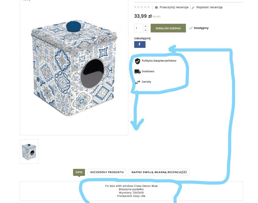 0 DecoMarLub Posted April 25, 2021 Author Share Posted April 25, 2021 (edited) On 4/21/2021 at 4:14 PM, krzysiuus said: Ten tag odpowiada za rozszerzony opis. {$product.description nofilter} Wstaw go gdzieś nad: {block name='hook_display_reassurance'} Po wstawieniu przetestuj działanie a następnie usuń stary kod opisu + dodaj modyfikacje w zakładkach. Chyba nie rozumiem W którym miejscu znaleźć te tagi i gdzie edytować można troszeczkę jaśniej Edited April 25, 2021 by DecoMarLub (see edit history) Link to comment Share on other sites More sharing options...