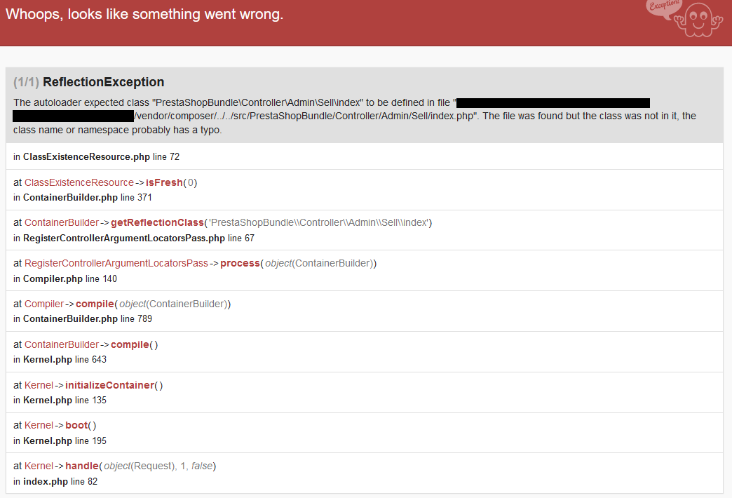 PHP Fatal error: Uncaught Symfony\\Component\\DependencyInjection\\Exception\\InvalidArgumentException: Expected to find class "PrestaShopBundle\\Controller\\Admin\\Sell\\index" in file "/var/www/vhosts/staging.shop.kerndruck.de/staging.shop.kerndruck.de/src/PrestaShopBundle/Controller/Admin/Sell/index.php" while importing services from resource "/var/www/vhosts/staging.shop.kerndruck.de/staging.shop.kerndruck.de/app/../src/PrestaShopBundle/Controller/*", but it was not found! Check the namespace prefix used with the resource. in /var/www/vhosts/staging.shop.kerndruck.de/staging.shop.kerndruck.de/vendor/symfony/symfony/src/Symfony/Component/DependencyInjection/Loader/FileLoader.php:157