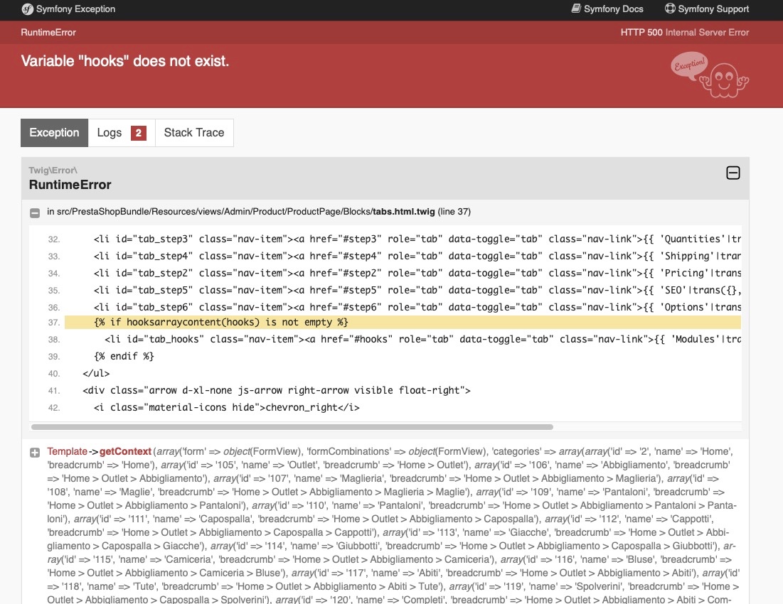 SirDuncan Posted May 3, 2021 Share Posted May 3, 2021 (edited) Buongiorno a tutti, ho un problema apparentemente venuto dal nulla. Quando entro nella scheda di un prodotto dall'amministrazione ricevo questo errore: ----------------- Variable "hooks" does not exist. in src/PrestaShopBundle/Resources/views/Admin/Product/ProductPage/Blocks/tabs.html.twig (line 37) 37 {% if hooksarraycontent(hooks) is not empty %} ----------------- Ho provato a fare diverse ricerche ma senza cospicui risultati. Ho anche provato a ripristinare un backup ma niente, il problema rimane. Ho provato a disabilitare tutti i moduli e gli override da Prestazioni ma niente, stesso problema. Senza la modalità di debug l'errore è questo: Sembra che si sia verificato un errore inaspettato Type error: Argument 1 passed to Symfony\Component\Form\FormRenderer::searchAndRenderBlock() must be an instance of Symfony\Component\Form\FormView, null given, called in /var/www/realilstore/var/cache/prod/twig/79/7937656adf40e09fee58d5d53fa3b1a2a20237fe3f154d1e24fa9bb4340d7b81.php on line 106 [Symfony\Component\Debug\Exception\FatalThrowableError 0] Qualche idea? Edited May 3, 2021 by SirDuncan aggiunte nuove info (see edit history) Link to comment Share on other sites More sharing options...
