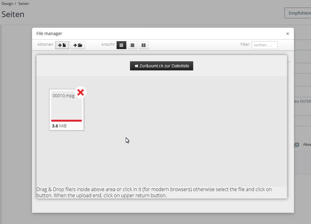 pixmax Posted May 12, 2021 Author Share Posted May 12, 2021 Hab das Limit auf 5 MB hochgesetzt (für Bilder). Hat keinen Effekt.Was hier fehlt ist eine klare Ansage, welche Video-Formate zugelassen sind. Ich versuche hier über das Backoffice ein 3,5 Mb großes Mpeg hochzuladen. Das geht irgendwie nicht. Aber ich werde das jetzt eh anders machen. Link to comment Share on other sites More sharing options...