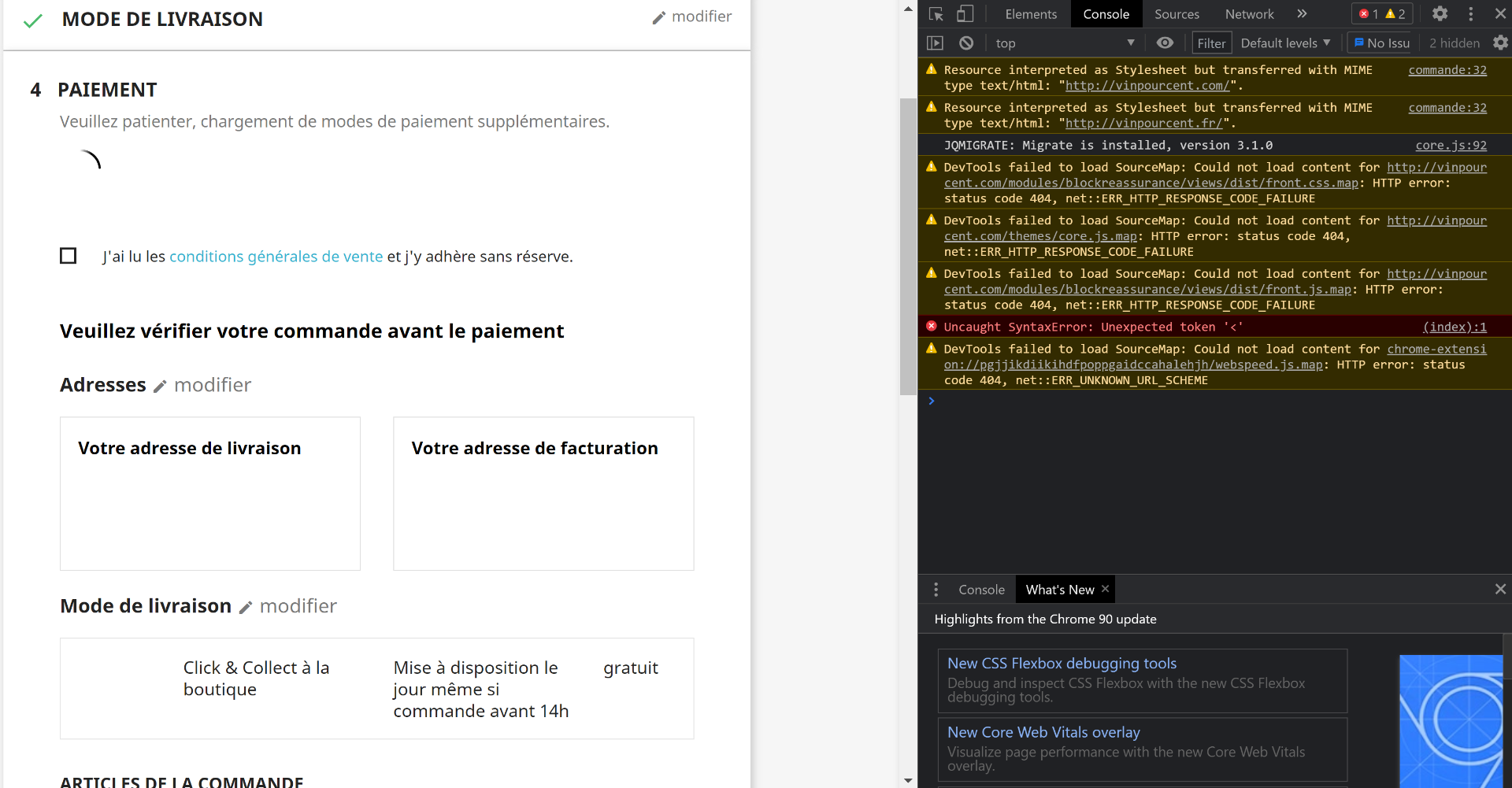 DoK_ Posted May 12, 2021 Share Posted May 12, 2021 Bonjour, Etant nouveau dans le monde Prestashop, j'ai réussi à monter une première boutique pour un projet pro familial. Je fais donc des tests d'achats pour vérifier que tout fonctionne, je sélectionne l'article, je le met dans le panier et je passe à la caisse. Je rentre toute les informations nécessaires, et j'arrive à l'étape paiement, et la j'ai un chargement infini. Rien ne se passe et je ne peux pas finaliser la commande. Pouvez vous m'aider s'il vous plaît ? Ci-dessous les caractéristiques de ma boutique : Type d’install (nouvelle/MàJ) : Nouvelle Version de PS : 1.7.7.3 URL du site concerné : vinpourcent.fr et vinpourcent.com Thème (défaut/perso) : défaut Code (original/modifié) : original Hébergement : OVH Version de PHP : PHP Version 7.2.34 Version de MySQL : MYSQL v.5.6 Navigateur(s) concerné(s) : Chrome Version 90.0.4430.93 (Build officiel) (64 bits) D'avance merci, DoK_ Link to comment Share on other sites More sharing options...