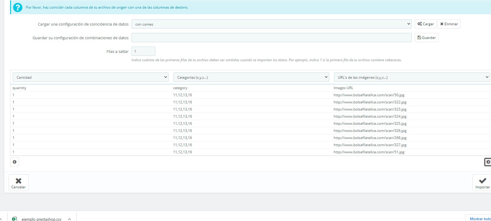 pegasus6464 Posted May 15, 2021 Share Posted May 15, 2021 (edited) estoy intentando importar mis productos con la función importar csv de prestashop 1.7.4.4, pero van mas de 50 intentos y no consigo importar nada. No sé donde puede estar el fallo. tengo un csv con estos campos ID;name;description_short;description;Price tax included;Tax rules ID;quantity;category;Images URL por mas que intento no logro nada, me devuelve este error Se produjeron errores: Technical error: Unexpected response returned by server. Import stopped. Realizamos los siguientes ajustes: Reescribir enlace parar Ed. 1 (ID null): reescrito como ed-1. Reescribir enlace parar Ed. 1 (ID null): reescrito como ed-1. Reescribir enlace parar Ed. 1A (ID null): reescrito como ed-1a. Reescribir enlace parar Ed. 1A (ID null): reescrito como ed-1a. Reescribir enlace parar Ed. 1A (ID null): reescrito como ed-1a. Lo de resscribir enlace supongo que es porque al nombre del producto tiene un espacio y le puso guión, pero no creo que influya No logro ver el fallo alguien puede echarme un cable se lo agradecería muchisimo estoy intentando hacerle una pagina a un amigo y no logro subir los lotes llevo ya una semana... Gracias a todos JOAQUIN MADRID FINAL2.csv Edited May 15, 2021 by pegasus6464 (see edit history) Link to comment Share on other sites More sharing options...