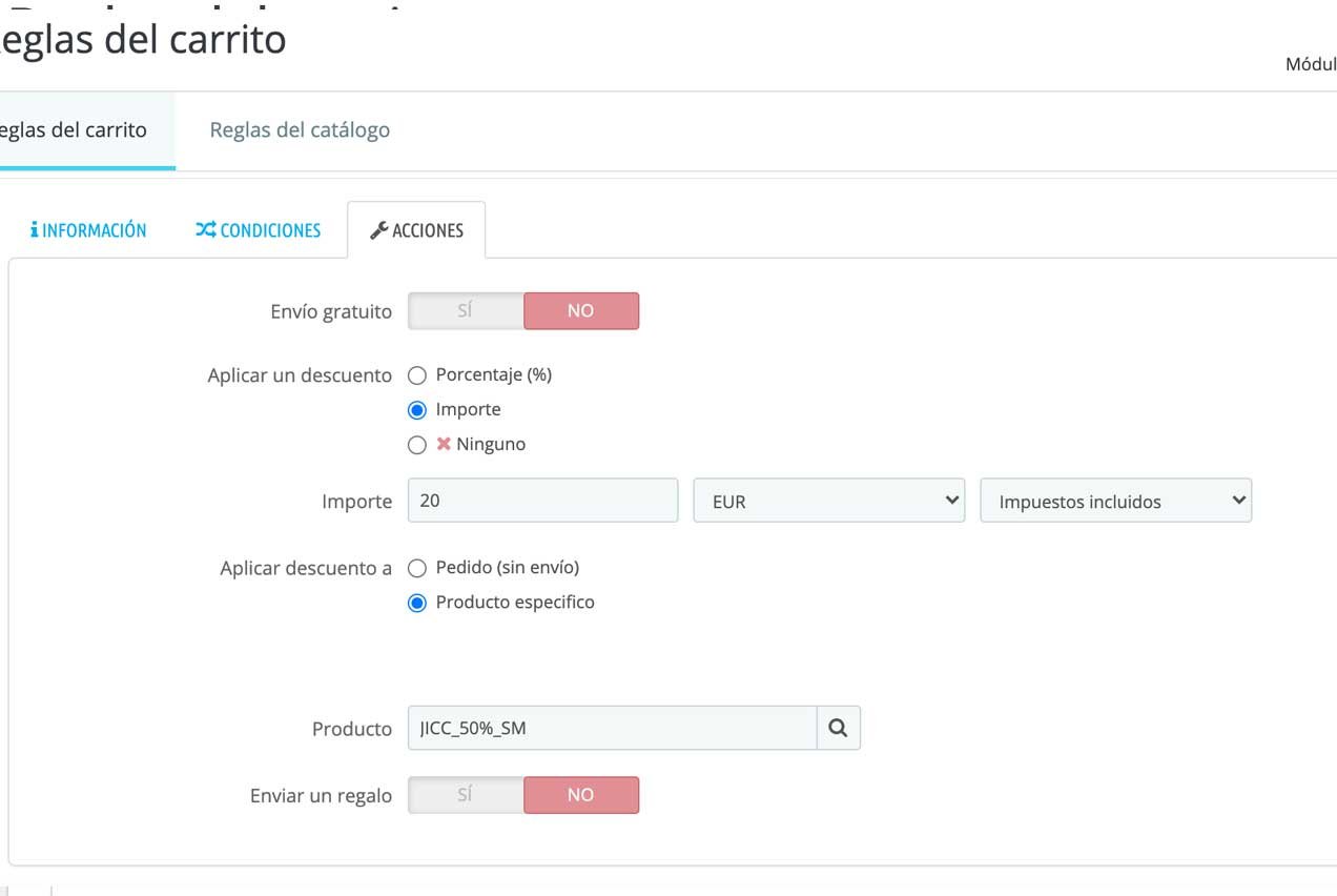 fernandido Posted May 17, 2021 Share Posted May 17, 2021 Hola a todos! Necesito hacer lo siguiente. Quiero poner un descuento de 20 euros a un producto. Todo funciona si es una unidad pero si fueran 2 unidades deberían ser 40 y eso no lo consigo. Muestro el descuento en la imagen. ¿Qué no está bien? En la pestaña de Condiciones también he visto que se pueden crear por producto pero no me lo hace igualmente. Muchas gracias Link to comment Share on other sites More sharing options...
