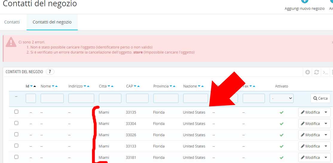 zklid Posted May 18, 2021 Share Posted May 18, 2021 Ciao, dopo aver installato prestashop, da CONFIGURA > Parametri negozio > Contatti seleziono la tab "Contatti del Negozio", vedo già presenti 5 contatti MIAMI(Florida). Il problema è che provando ad eliminarli non ottengo alcun risultato (allego immagine). Ho inserito in seguito i contatti dei miei negozi e relative coordinate google map, ma non ottengo alcun risultato sulla mappa, che mi visualizza una generica località diversa da quelle da me inserite. Puo' dipendere dal fatto che non riesca ad eliminare i contatti che ho trovato preimpostati? Come posso risolvere? Grazie Link to comment Share on other sites More sharing options...