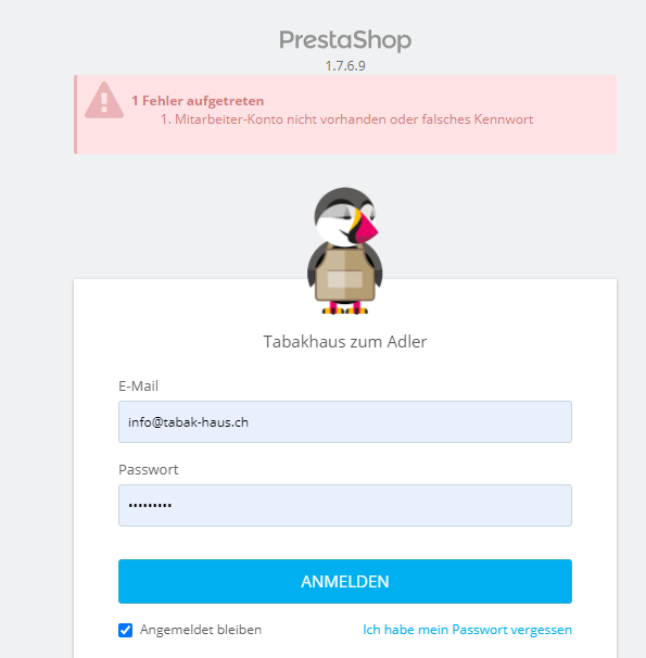 Maria Flores Posted May 19, 2021 Share Posted May 19, 2021 leider kann ich mich im Presta nicht mehr einloggen. dies wird angezeigt nach dem Versuch. 1 Fehler aufgetreten Mitarbeiter-Konto nicht vorhanden oder falsches Kennwort bitte um Hilfe, danke Link to comment Share on other sites More sharing options...
